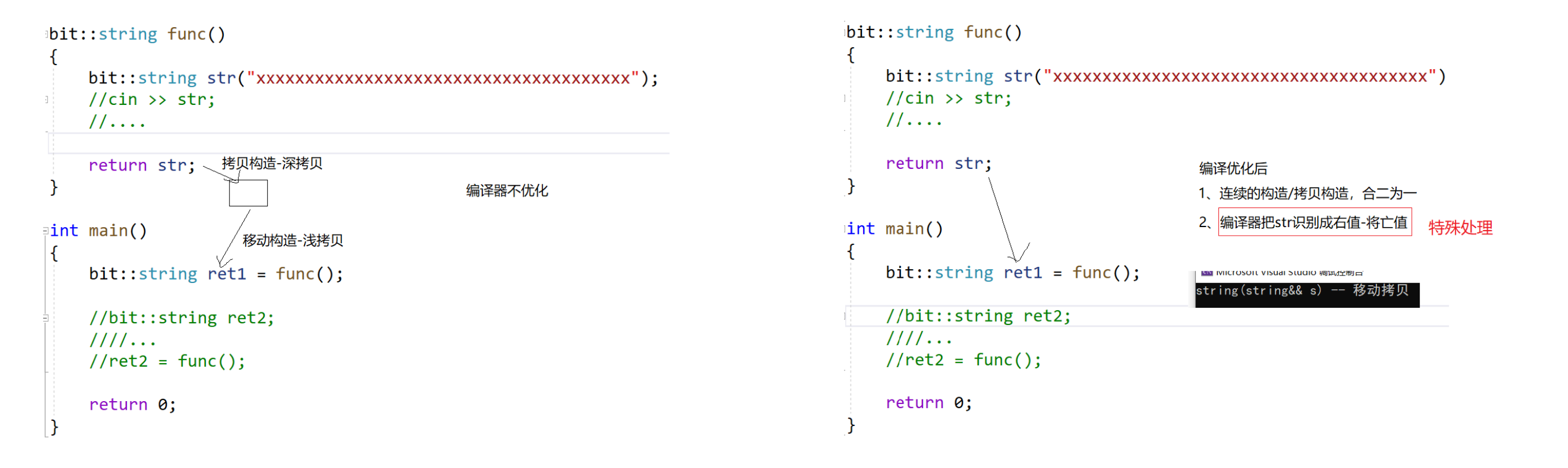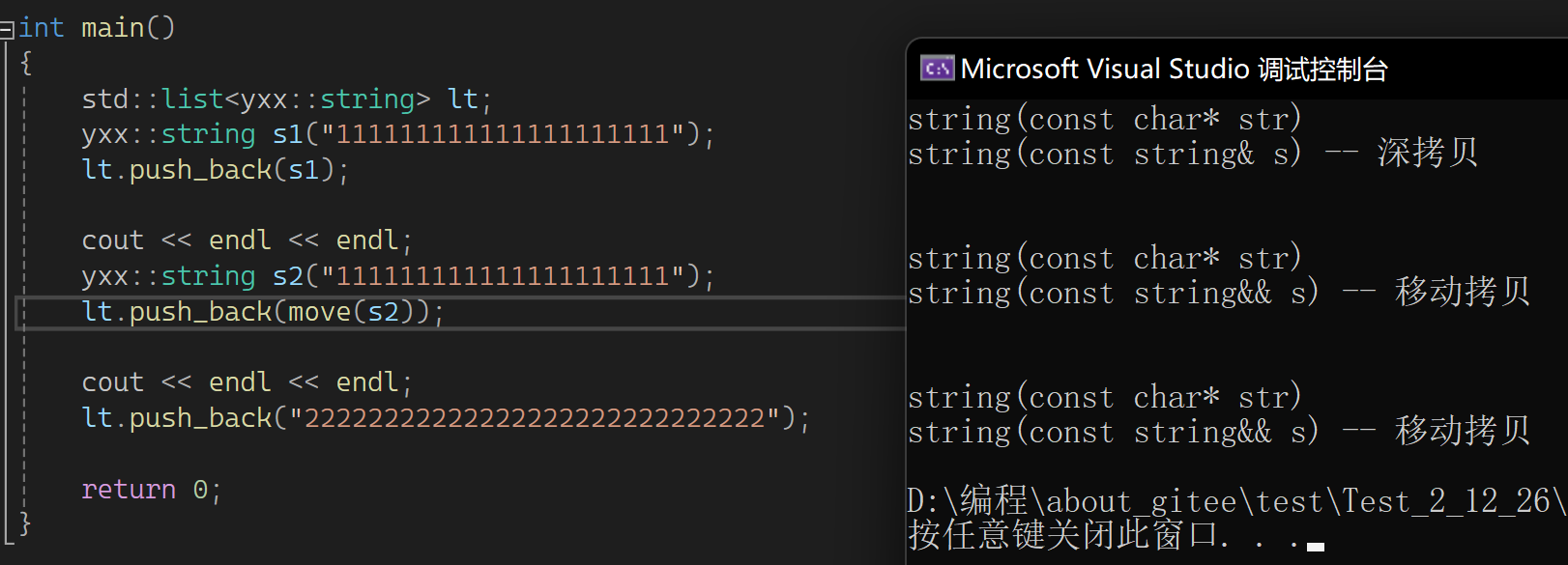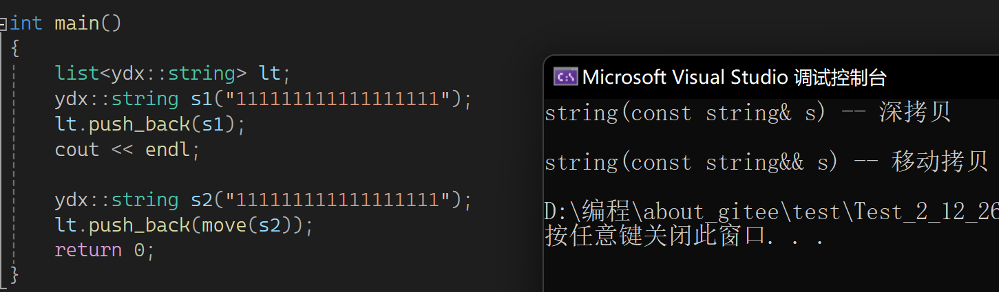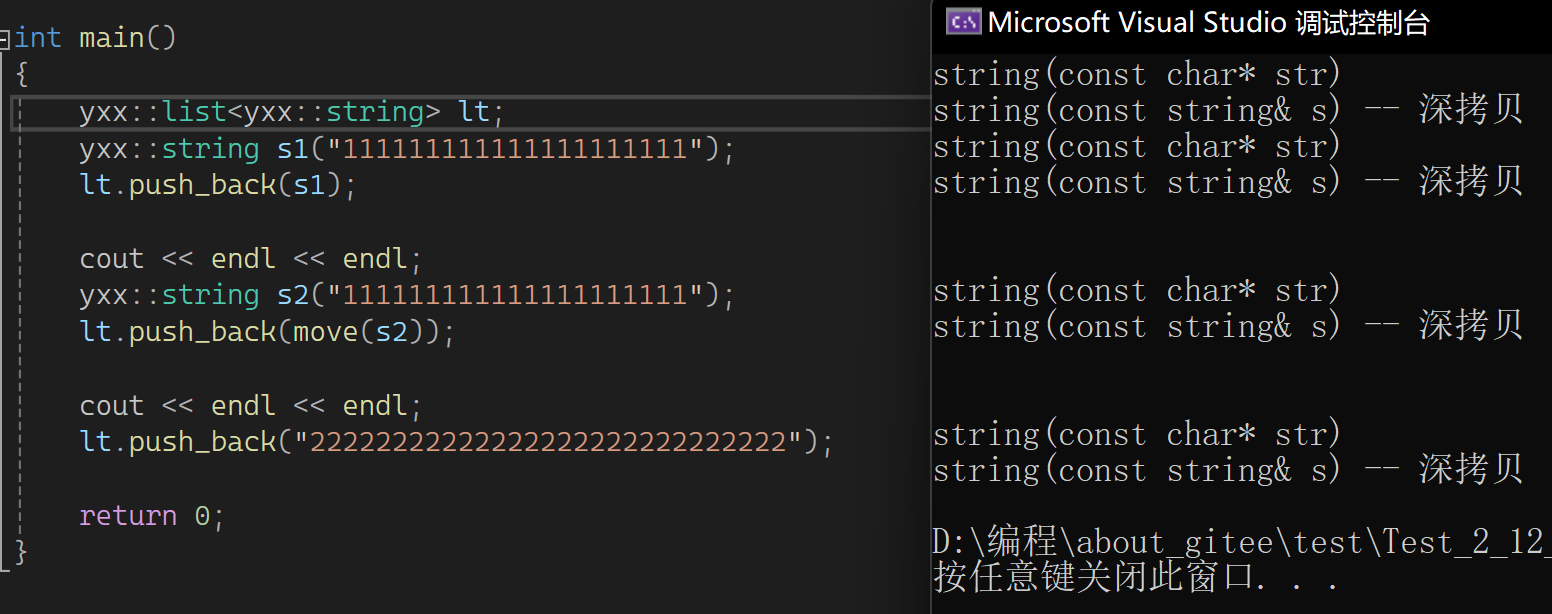 这样写也是一个移动构造,因为不能直接传值给string。先是构造临时或匿名对象,然后传左值过去资源转移。意味着这里比以前方式少拷贝一次,以前是构造+拷贝构造,现在是构造+移动构造。连续拷贝优化在同一行同一步骤,假如屏蔽移动构造,就都是构造+拷贝构造。那屏蔽后威慑右值也是深拷贝?