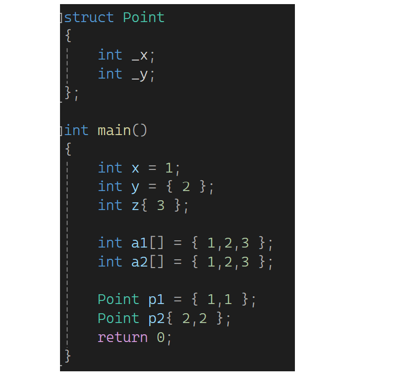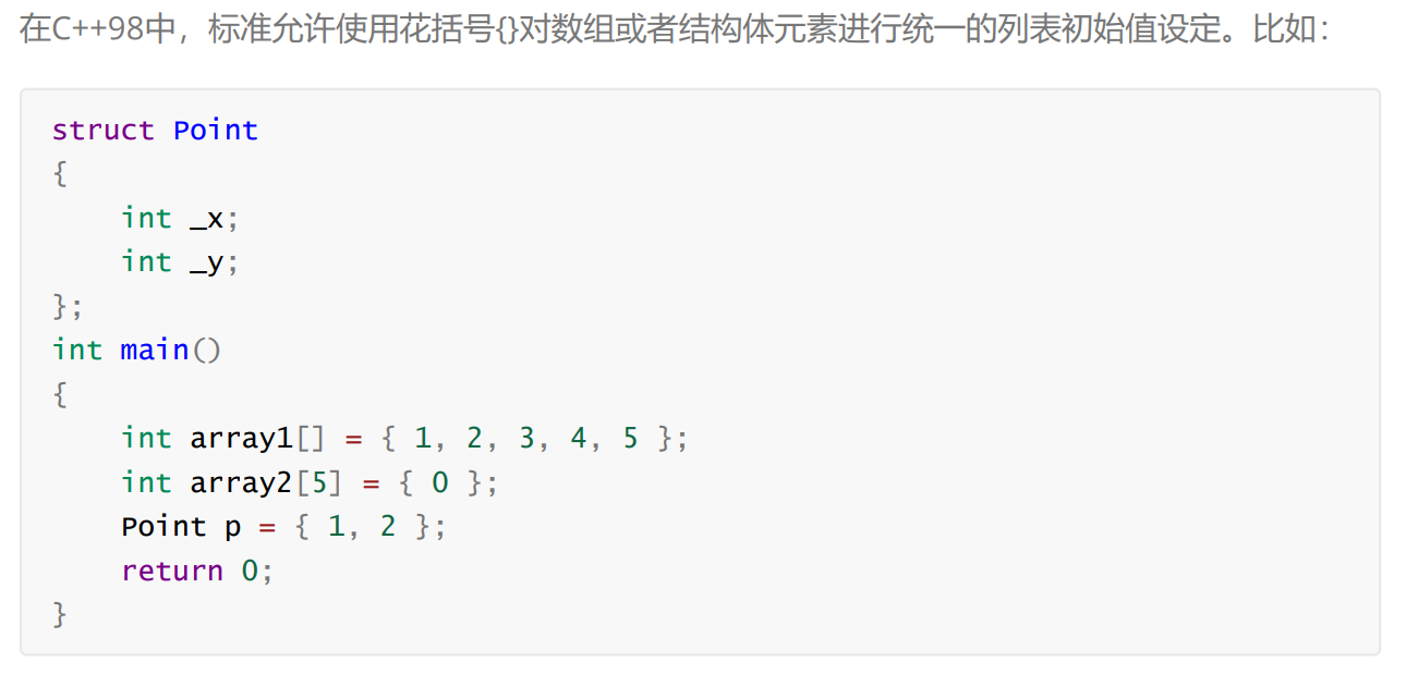 C++11中更新了一些特性是关于初始化,有些地方叫列表初始化,就是用一对花括号去进行初始化: