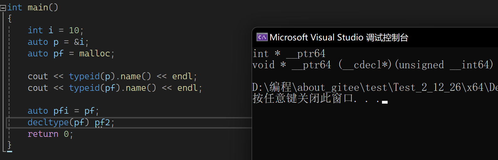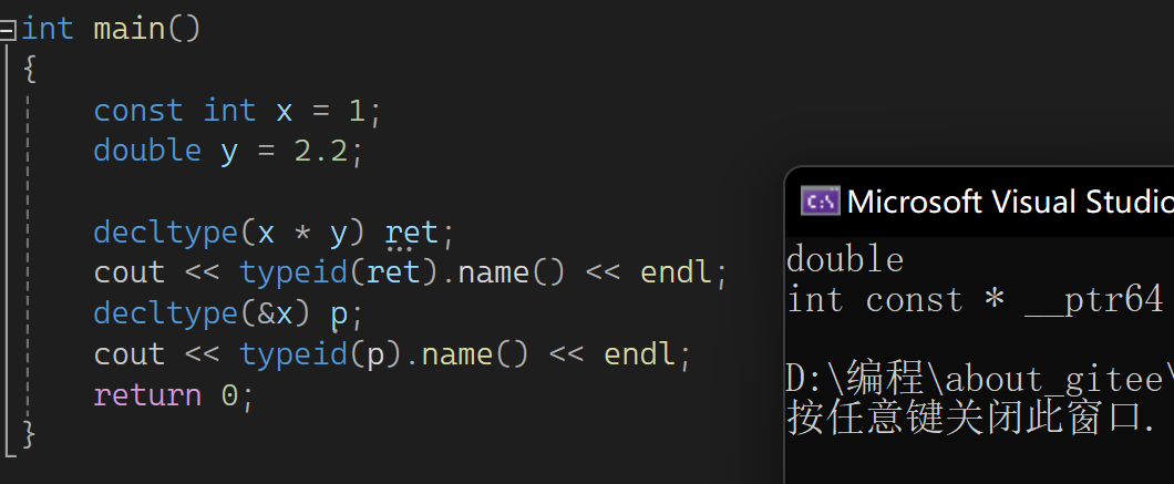 main中传一个类型要去实例化B,如B<>bb,不想写函数指针怎么办?此时可以B<decltype(pf)> bb。typeid推出的类型是一个字符串,只能看不能用;auto不能单独不能初始值定义变量;decltype推出对象的类型,可再定义变量,或者作为模板实参,还可以推一个表达式:
