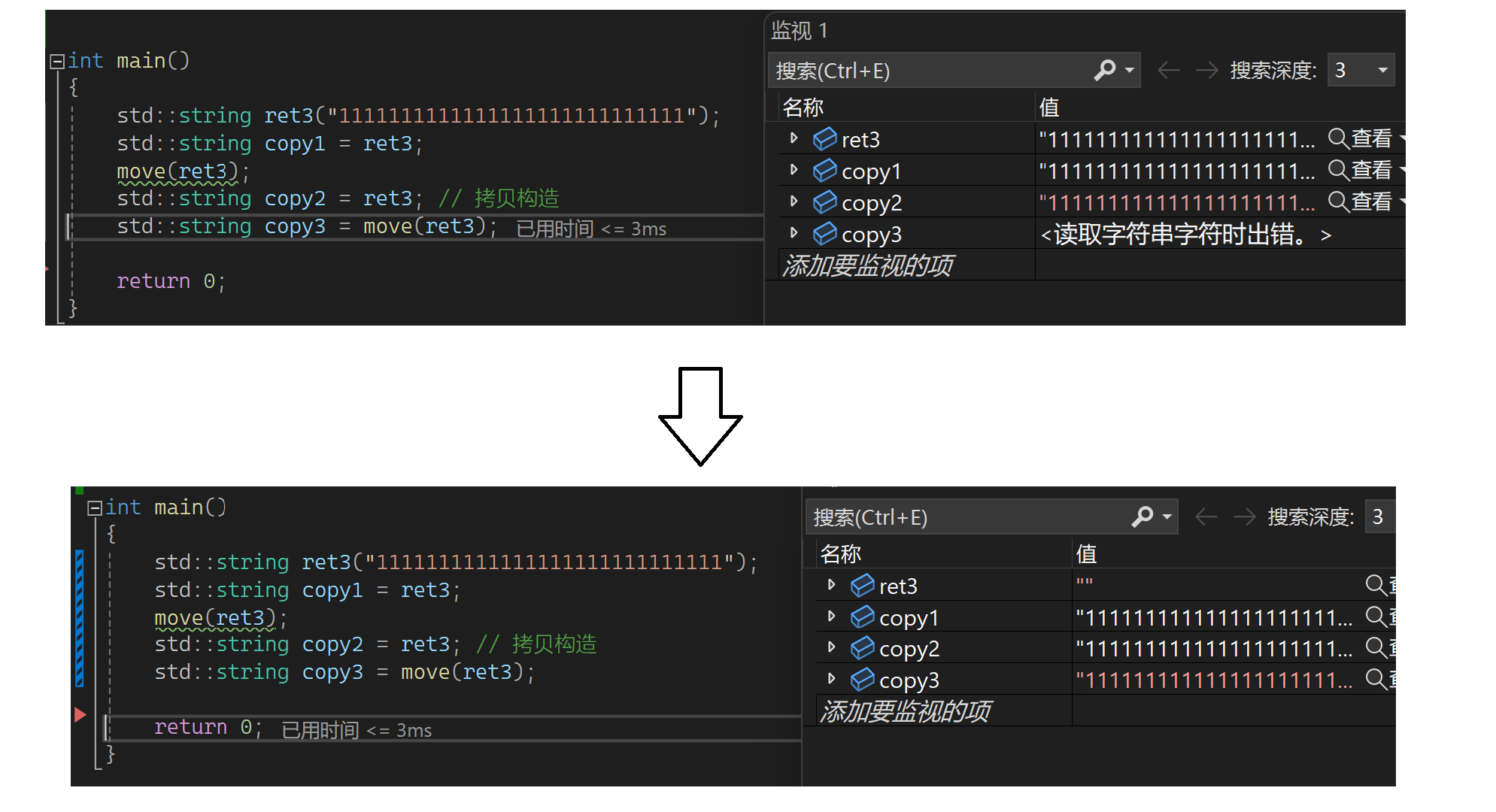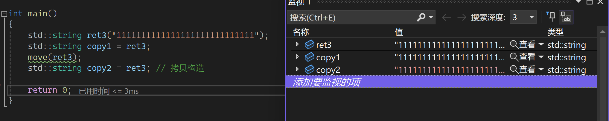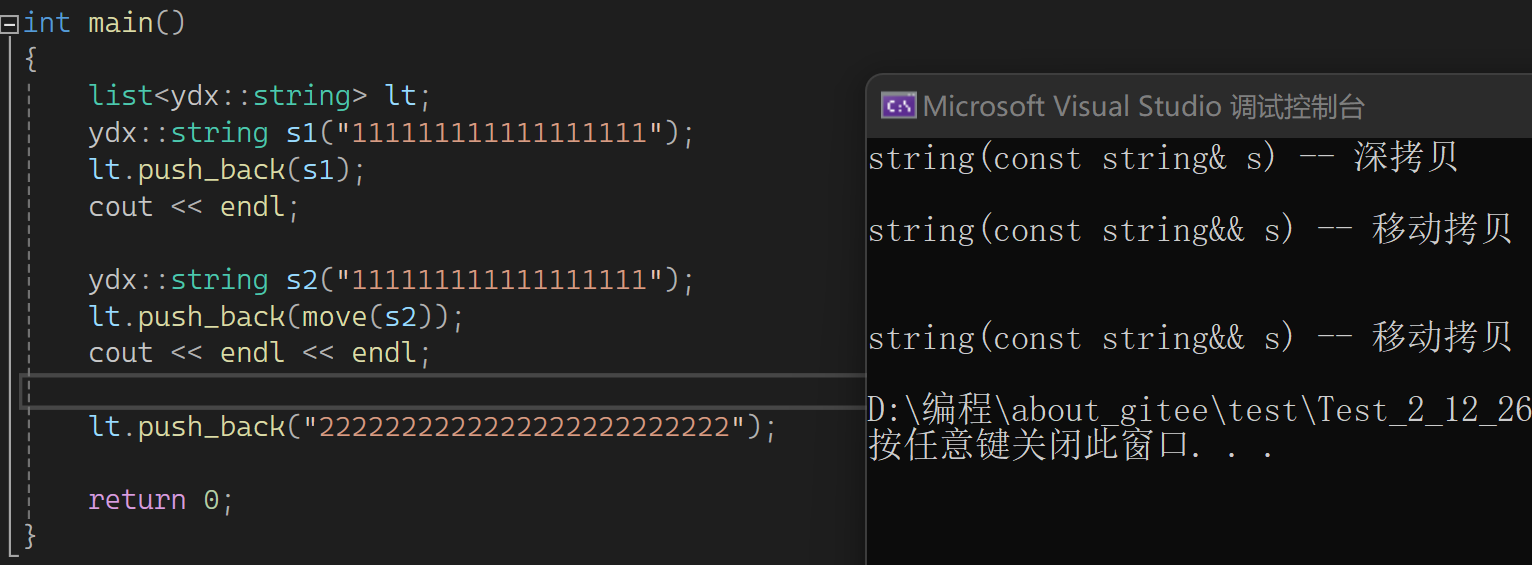 通过这里可猜测一下move(ret3)这里是个函数调用,会返回右值且右值和ret3中的资源是一样的。也可以这样理解,返回的是ret3的引用,但这个值会变为右值,ret3本身没有变右值,返回的是ret3的右值。所以把一个值move以后再去拷贝构造要小心一些,相当于赋予了别人一个权力,可把你的资源给抢走。move的意义就是我想让一个对象资源被别人抢走,就move一下再交给别人,不想就别去动。下面看看场景2(用自己写的,这样方便看拷贝或移动构造),先看结果: