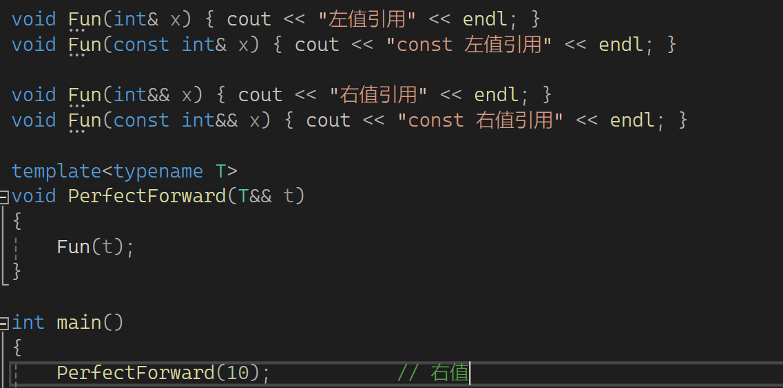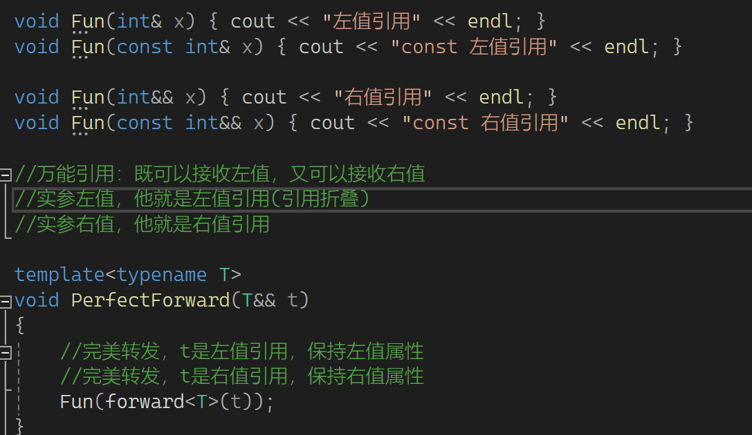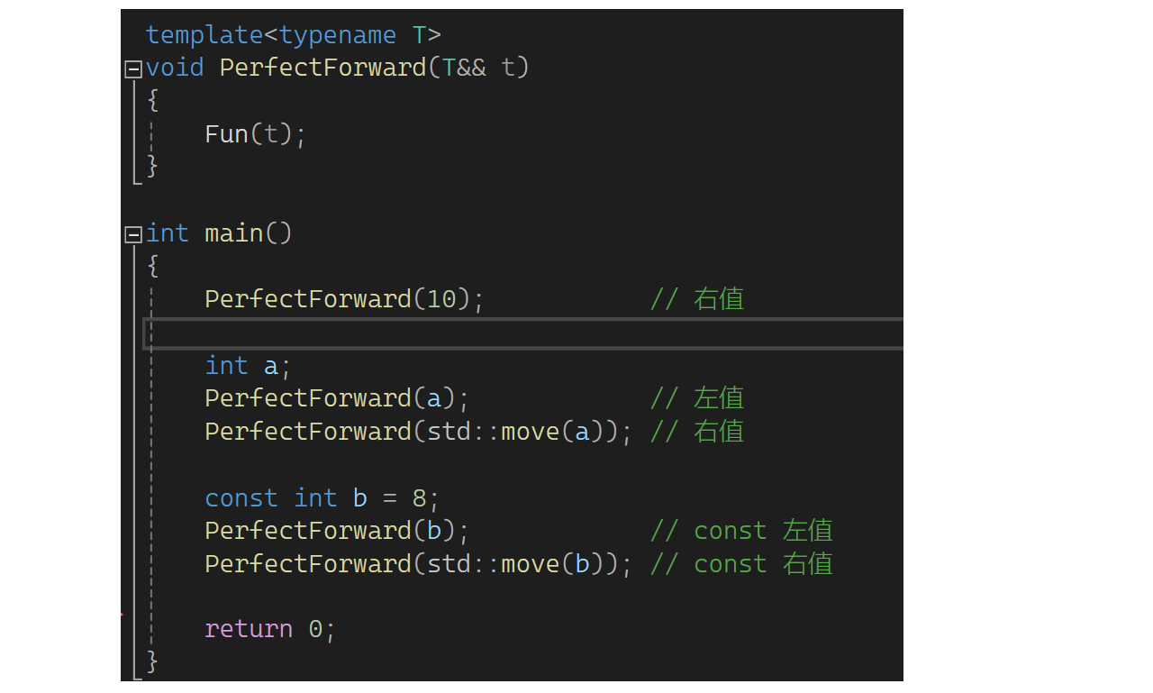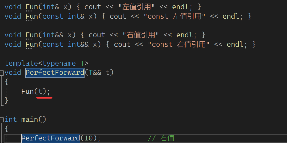 t的属性是左值,因此匹配的是左值引用,这就是为什么匹配的都是左值引用。那如果就想让t保持它原有的属性呢?c++给了我们一个东西可保持它的属性,这个东西叫完美转发,它是库里的一个函数,这样用: