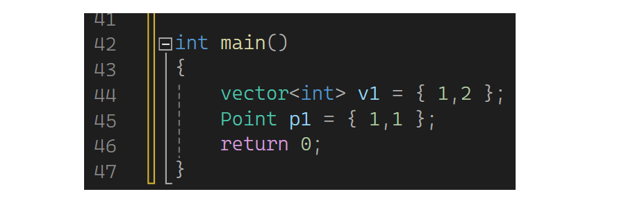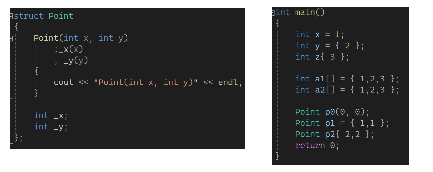 如果是map怎么初始化?直接map<string, string> dict = {"sort","排序","left","左边"}不行,map也支持了initializer_list的构造,但是map这的initializer_list的T是个pair,所以要{ {...}, {...} }这样写包含双重定义,最外的两个括号代表initializer_list,里面的两个可写成pair有名/匿名对象/花括号,若是花括号就类似于又走了一个像Point p1 = {1,13}这个样子。