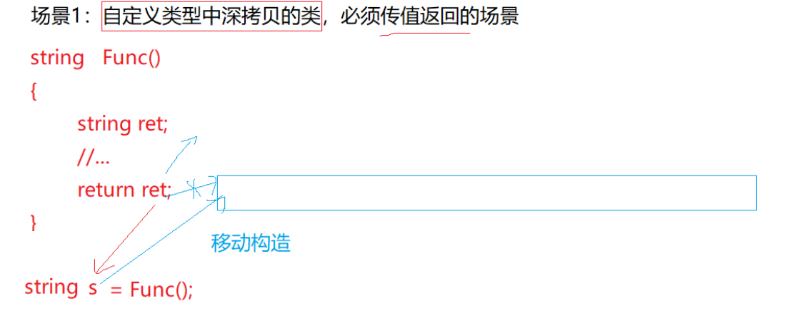 如果传值返回,中间会生成一个临时对象,临时对象是个将亡值,可用移动构造降低拷贝的代价。再看一个场景: