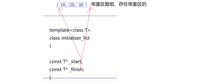 也可认为它是一个容器。它的原理是:{10,20,30}这是个常量数组,存在常量区的。底层大概是这样: