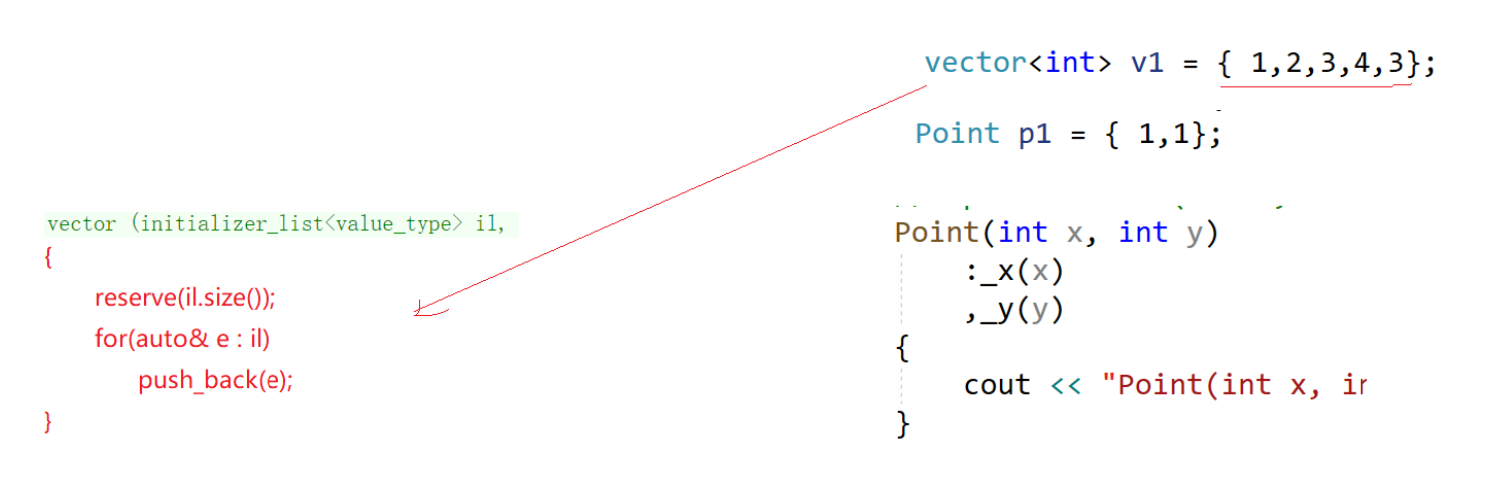 把常量数组赋值过来,就让_start指向开始,_finish指向结束位置的下一个位置。也可以这样写:initializer_list<int> il = {10,20,30},本质还是调用initializer_list的构造函数,会想办法取到这段空间开始和结束的地址给_start和_finish。那vector<int> v1 = {1,2,3,4}这样是怎么支持的?因为vector写了这样的构造函数: