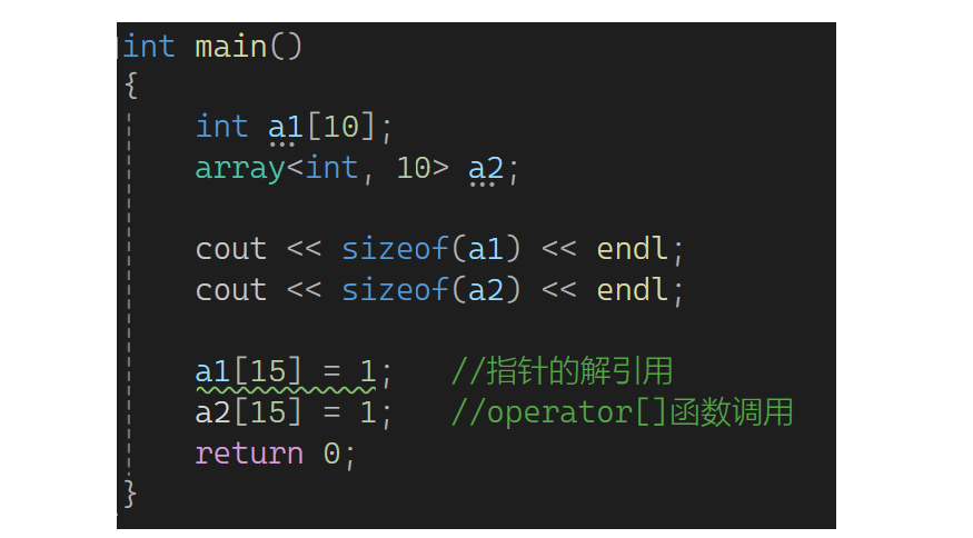 用颜色圈起来的都是C++11新增的,map和set很熟了,array是一个静态数组,用非模板参数定义数组的大小,对比静态数组而言大多没区别,唯一的好处是对越界检查严格: