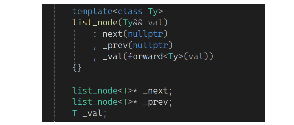 左边这样的情况属性被识别为左值,这样才能完成资源转移;右边这样的情况val被识别为左值,这样会匹配const string& val,但需要它保持右值属性,这里可以利用完美转发,让它匹配到右值调那一个(也就是最开始匹配了左值和右值的,第二次的时候右值变量有了左值的属性)。下面把完美转发利用到链表中感受一下,为了方便测试屏蔽一下,顺便string的拷贝用正常的方式: