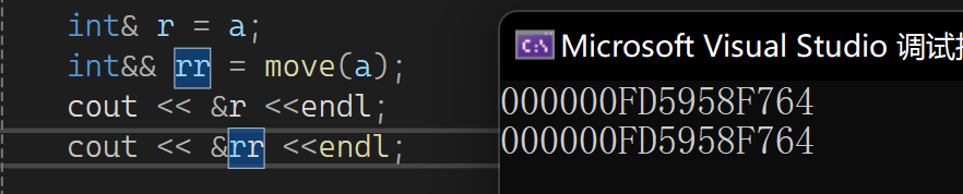 从属性上来说它们都是左值,从地址上来说它们地址一样。可以这样理解:我是右值,我不能修改,你是我的引用,可认为你开了一块空间,把我的值给存起来了,比如: