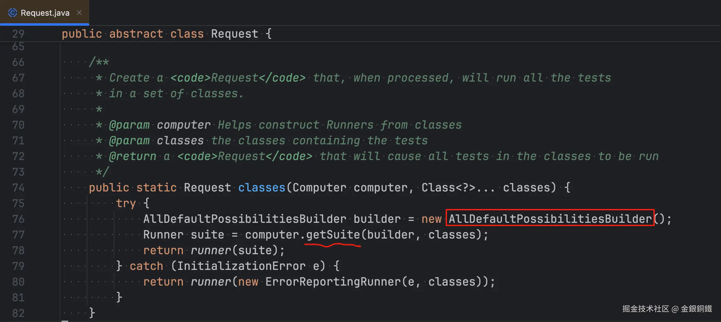第四步的逻辑,如果展开来说,会比较多。目前我们只看构造 Runner 的部分(至于如何通过 Runner 来运行测试,后续的文章再来探讨)。构造 Runner 的核心逻辑在 org.junit.runner.Request 类的classes(org.junit.runner.Computer, java.lang.Class<?>...) 方法里。