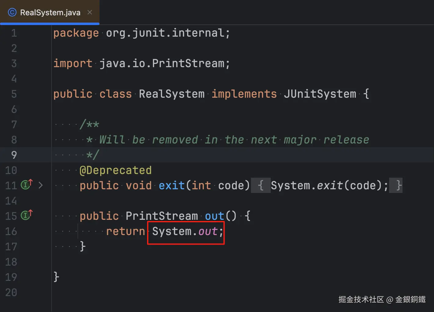 system.out() 其实就是 System.out。因为 runMain(...) 方法的入参中的 system 是 org.junit.internal.RealSystem 类的实例,而 RealSystem 的 out() 方法返回的就是 System.out ⬇️