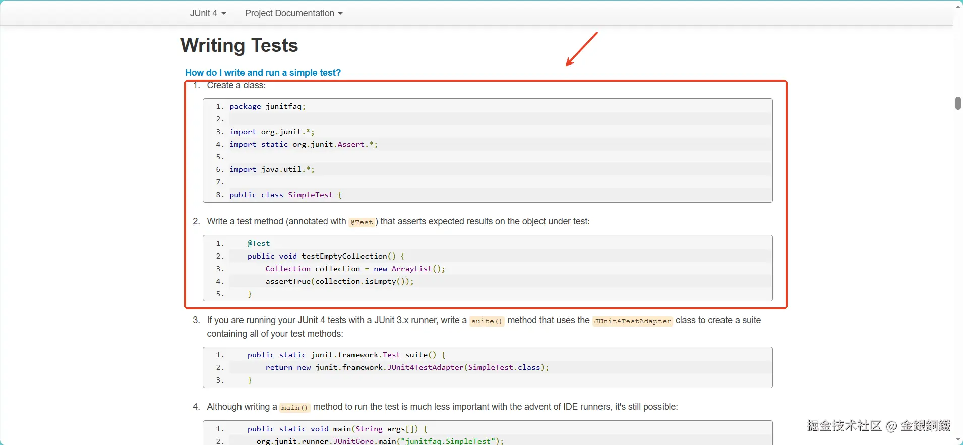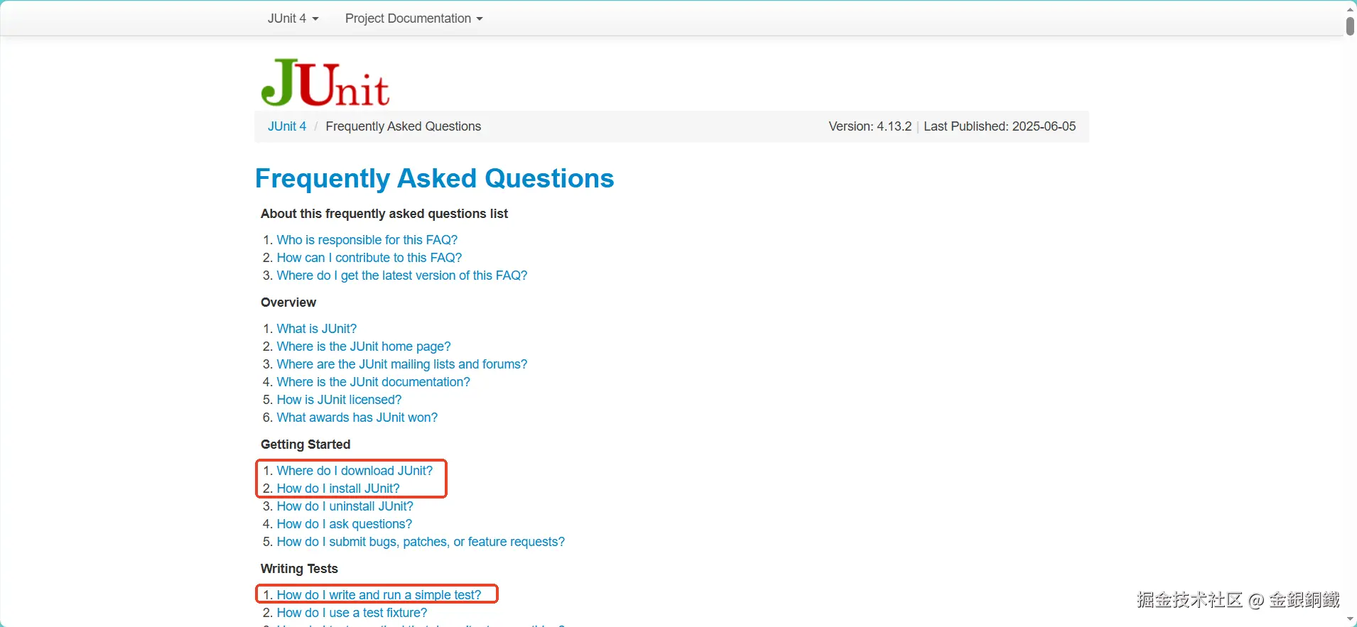 junit.org/junit4/ 是 JUnit 4 的网站。这个网站有 Frequently Asked Questions 页面。本文关心其中的 3 个问题(这 3 个问题我在下图用红框标出来了)