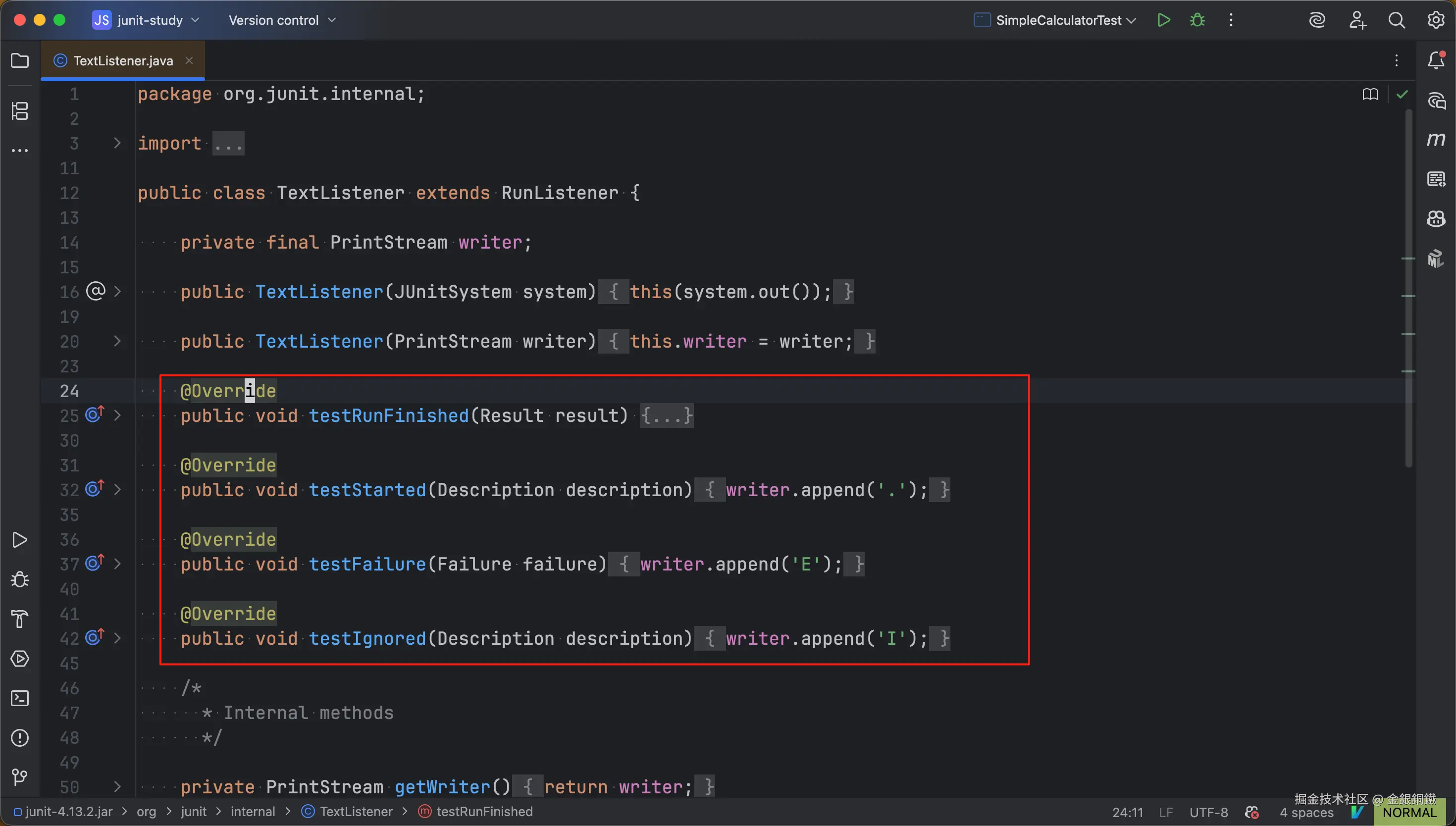 TextListener override 了 RunListener 中的 4 个方法 ⬇️ 所以在对应的 4 种事件发生时,这 4 个方法会被调用。