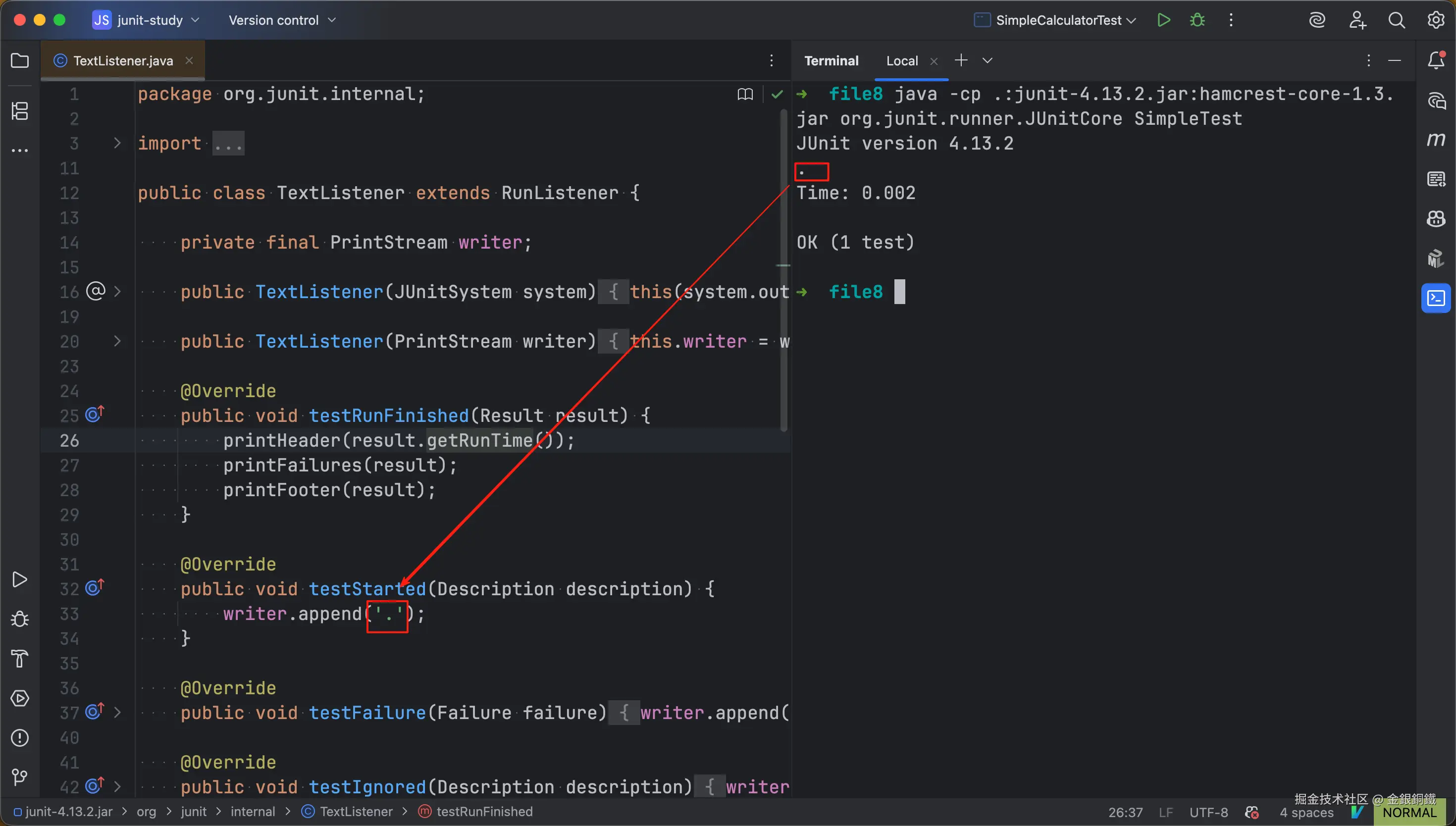 java -cp .:junit-4.13.2.jar:hamcrest-core-1.3.jar org.junit.runner.JUnitCore SimpleTest 这个命令的运行结果中的 . 就来自 testStarted(Description description) 方法(如下图所示 ⬇️)