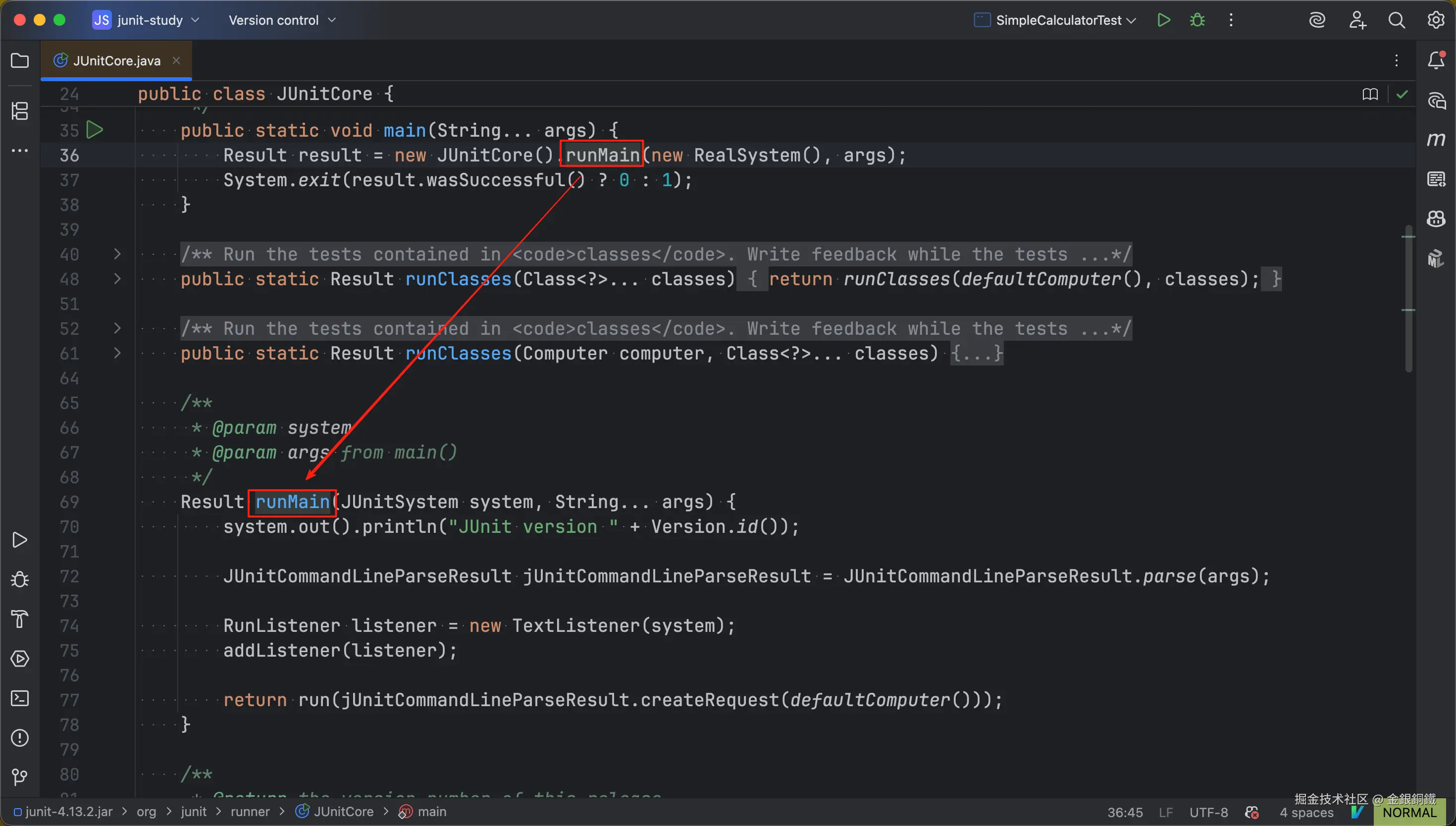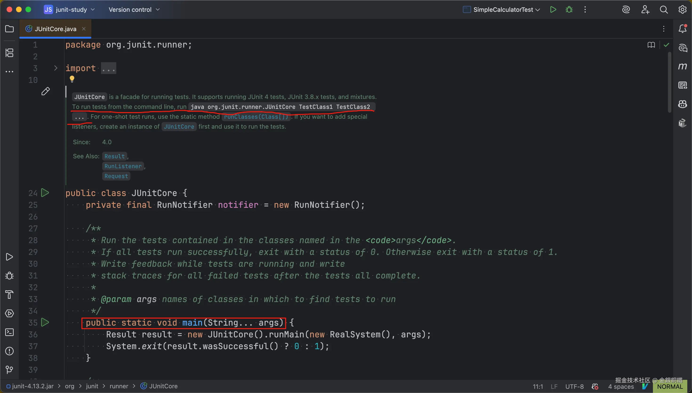 我们来看看这些内容是从哪里来的。从 java -cp .:junit-4.13.2.jar:hamcrest-core-1.3.jar org.junit.runner.JUnitCore SimpleTest 这个命令来看,我们会运行 org.junit.runner.JUnitCore 类的 main 方法,而 main 方法的参数是一个数组,这个数组中只有一个元素,即, "SimpleTest" 。我们去看看 org.junit.runner.JUnitCore 这个类 ⬇️