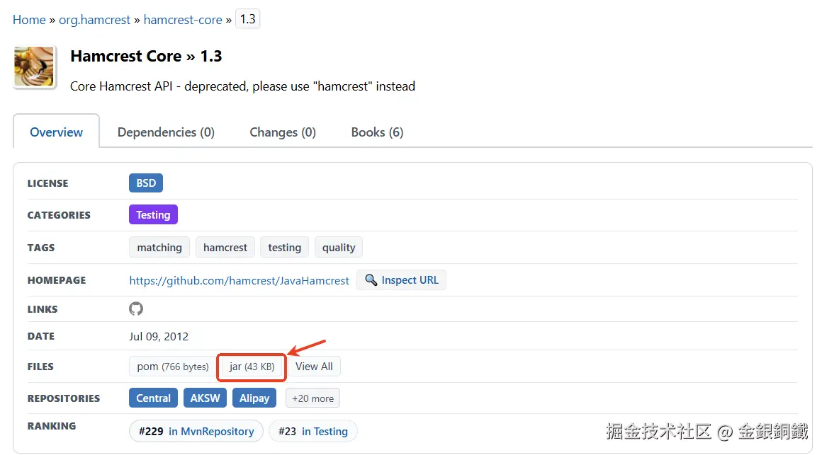 由于 JUnit 4 依赖了 hamcrest-core,我们前往 Maven Repository: org.hamcrest >> hamcrest-core >> 1.3 页面把 hamcrest-core 的 jar 包也下载下来(点击下图红框所示的位置就可以下载这个 jar 包)
