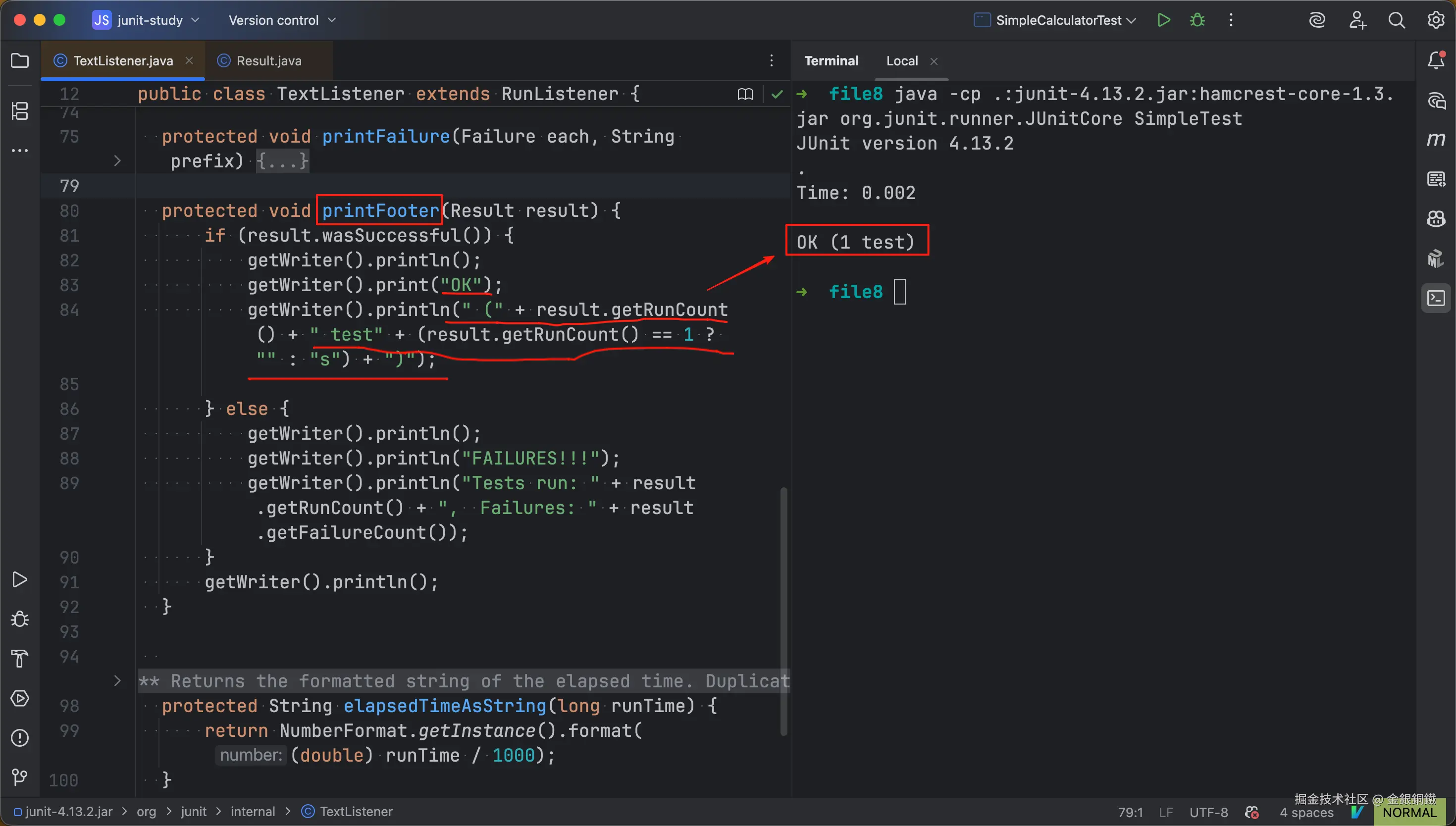 我们这个例子里没有失败的单元测试,所以就不看 printFailures(Result result) 方法了。