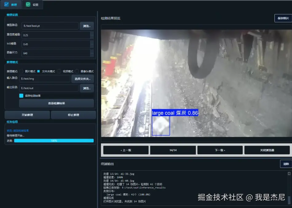 本文围绕矿井复杂环境下的煤炭图像识别需求,系统阐述了一套基于 YOLOv8 与 PyQt5 的煤炭图像智能检测解决方案。从数据集构建、模型训练与评估,到推理流程及图形化界面部署,完整展示了工业视觉项目从算法到应用落地的全过程。实践结果表明,YOLOv8 在矿井场景中具备良好的检测精度与实时性能,而 PyQt5 界面有效降低了系统使用与部署门槛,使模型真正具备工程化和产品化能力。该方案可直接服务于煤炭分拣、矿区巡检等智慧矿山应用,也为工业场景下目标检测系统的设计与实现提供了可复用的技术范式。