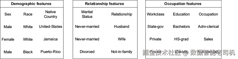 我们先加载收入数据,用 Pandas 的 describe 与 info 获取一些基本描述性统计,如清单 4.1 所示。我们的数据只包含类别变量(取值数量固定的变量),包括 Workclass、Education、Marital-Status、Occupation、Relationship、Race、Sex 与 Native_country。此外还有目标变量 Target,它是二值:<=50K 或 >50K。