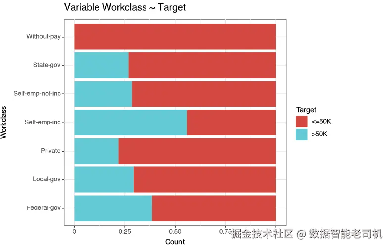 图 4.2 对比 workclass 各类别相对于目标变量分布的图