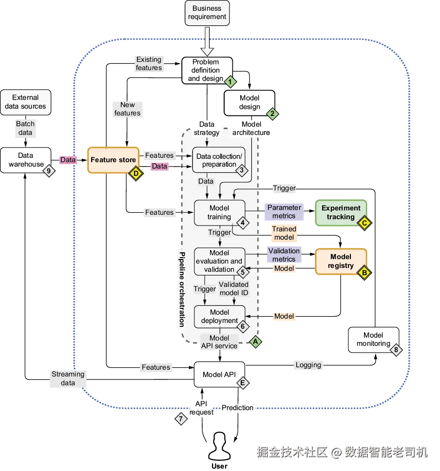 图 4.1 心智地图:我们现在聚焦特征库(D)、实验追踪(C)与模型注册表(B)