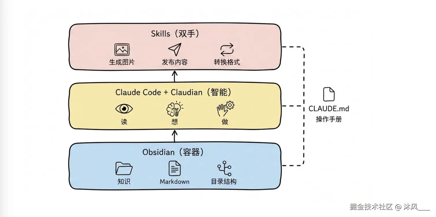 这套系统的核心逻辑很简单:Obsidian 装知识,Claude Code 执行动作,Skills 提供能力,CLAUDE.md 定义规则。