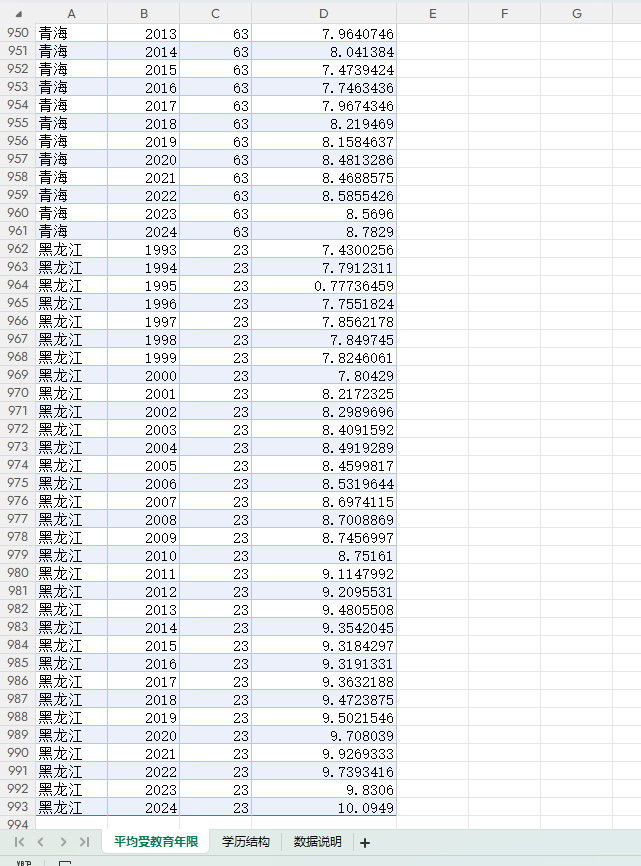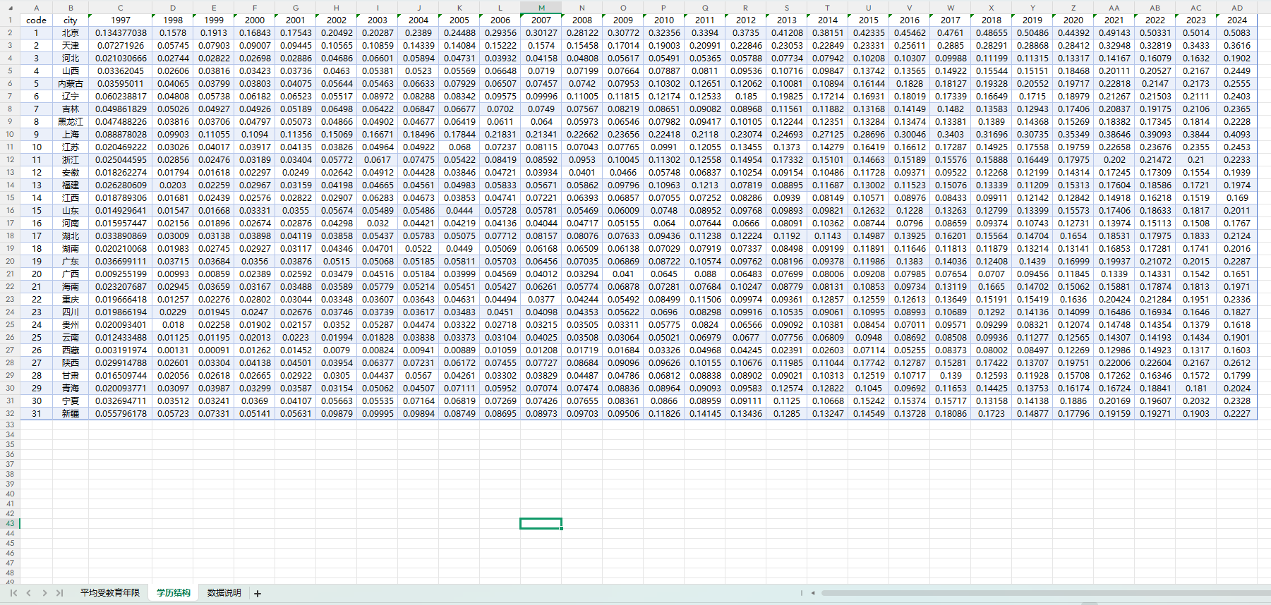 一、数据简介:本次数据为各省平均受教育年限与学历结构数据,其数据来源为中国统计年鉴,计算方式为平均受教育年限=(小学学历人数*6+初中学历人数*9+高中和中专学历人数*12+大专及本科以上学历人数*16)/6岁以上人口总数;学历结构=大专及本科以上学历人数/6岁以上人口总数。基于中国各省平均受教育年限与学历结构数据,可展开多维度关联性与应用性研究:一是区域教育发展差异研究,对比东中西部、南北方各省数据,分析教育资源分配不均衡的表现、成因及演化趋势,探究经济发展水平与教育发展的相互作用机制;二是学历结构与平均受教育年限的协同演进研究,分析各省不同学历层次(小学、初中、高中、大专及以上)人口占比与平均受教育年限的匹配度,研判教育普及政策的实施成效;三是与社会经济指标的关联性研究,探究两省数据与人均GDP、产业结构、就业率、人口老龄化等指标的相关性,揭示教育对区域经济发展、产业转型升级的支撑作用及滞后效应;四是教育公平与优化路径研究,聚焦各省内部城乡、性别间的教育差距,结合数据提出针对性的教育资源均衡配置建议;五是人才供给与需求适配性研究,结合各省产业布局,分析学历结构是否契合区域人才需求,为各省教育规划、人才引进政策制定提供数据支撑,助力区域教育与经济社会协同发展。