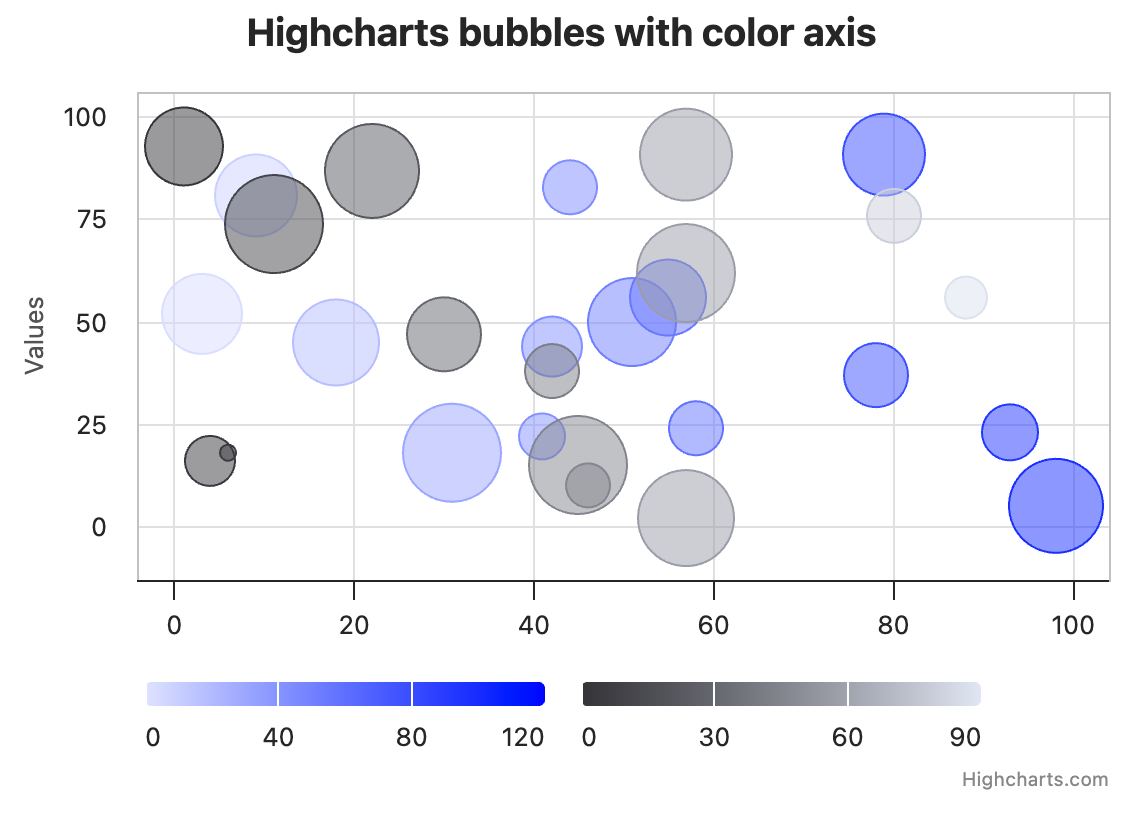 虽然气泡系列默认通过x、y和z选项呈现三维数据,但它也可以通过自定义颜色键添加第四个维度。气泡系列的默认颜色键是z,但可以更改为例如colorValue。在这种情况下,系列配置可能如下所示: