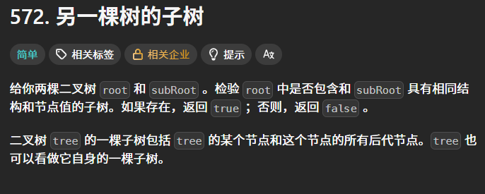 这道题和第二题类似当我们进行递归时如果某次root的值与subroot相同时则开始进行比较两者是否相同,如果判断两者不同时不能直接返回false,原因是可能后面的递归会出现相同的情况只是一次判断不能说明没有相同的树只有当递归到空节点也就是到底时如果root的值与subroot的值还是不同则说明返回false
