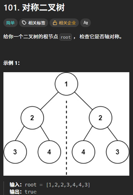 首先我们要证明根节点的左右孩子相同如果不相同则直接返回false相同则开始递归然后要同时证明第二层第一个节点的左孩子和第二个节点的右孩子是否相同以及第一个节点的右孩子和第二个节点的左孩子是否相同如果有一种情况不同就直接返回false,这样我们就需要两个变量同时进行所以我们还需要自己创建一个函数当某次递归如果其中一边不为空而另一边为空则说明树不对称也返回false,创建的函数将根节点的左子树和右子树带入也就相当于变成两个树的判断