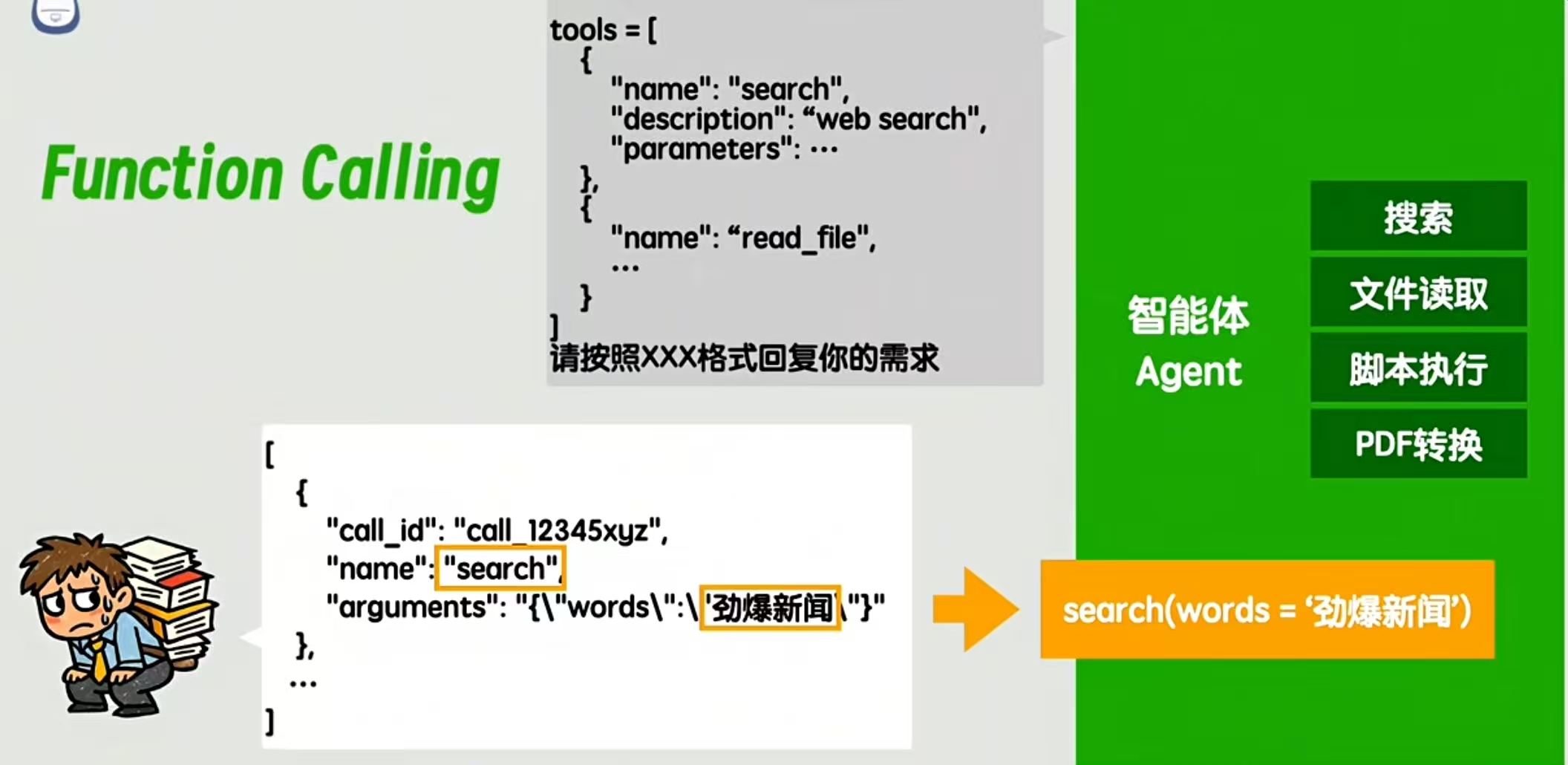 Function Calling(函数调用):Agent 与大模型的沟通格式约定(如 JSON 格式),确保大模型提出的工具使用需求(如查异地报销比例)能被 Agent 准确解析。