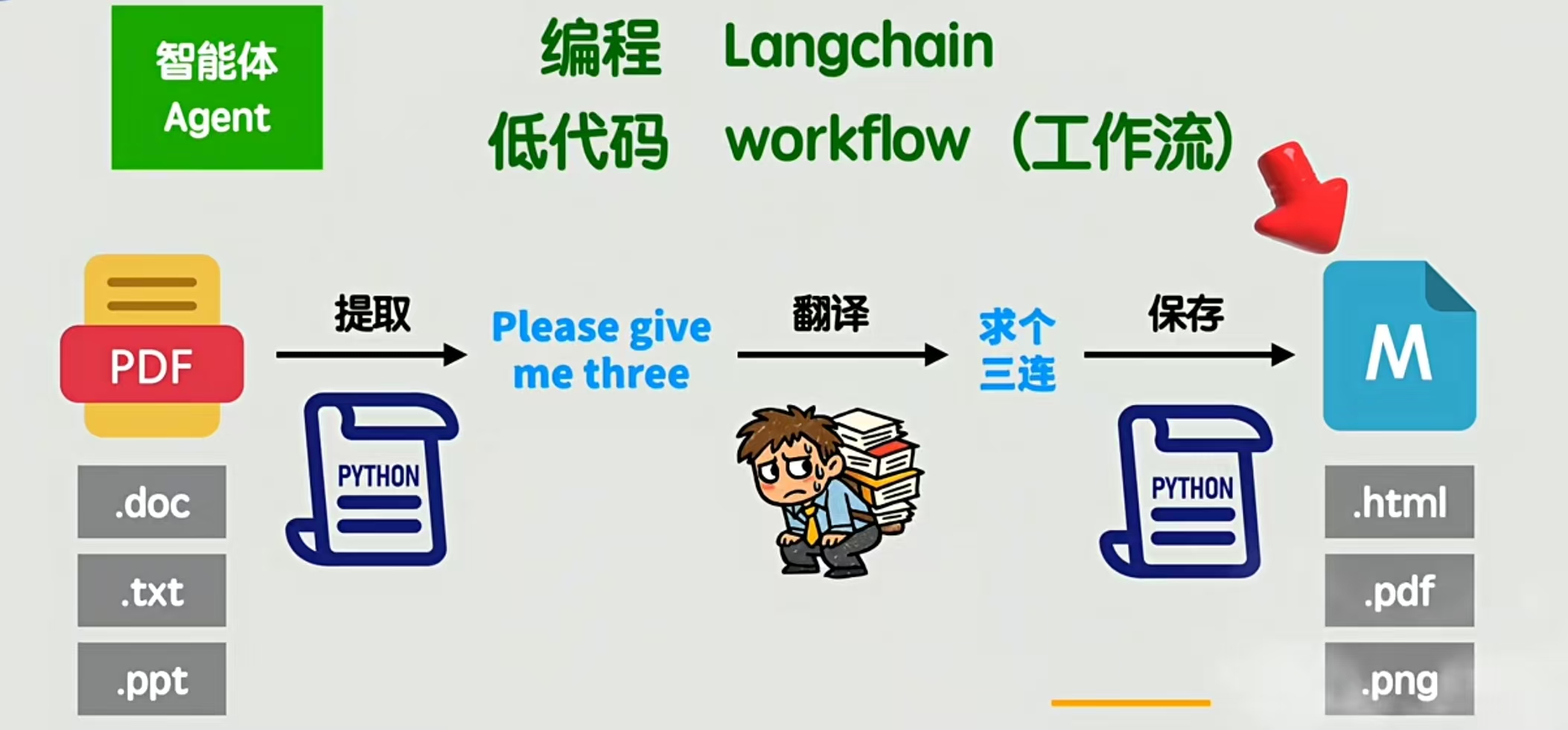 LangChain:纯编程,死板但稳定,程序员专用。比如程序员用 LangChain 写代码:"第一步读取门诊报销申请→第二步调用参保核对工具→第三步检索门诊政策→第四步计算报销金额→第五步生成结论",代码写死了,每次只能处理门诊报销,要处理住院报销就得改代码;