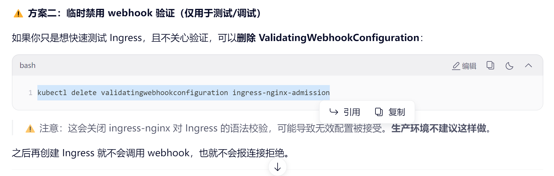 方便调试 临时禁用 ingress-nginx admission webhoo
