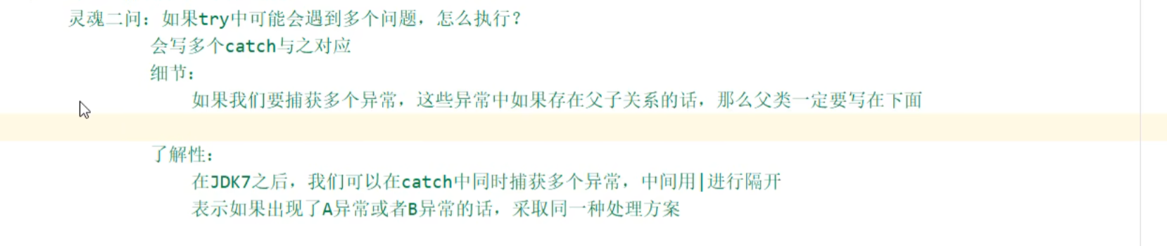 之所以要写在下面,是因为异常也是存在多态的,如果父类写在上面,子类的小异常也会匹配