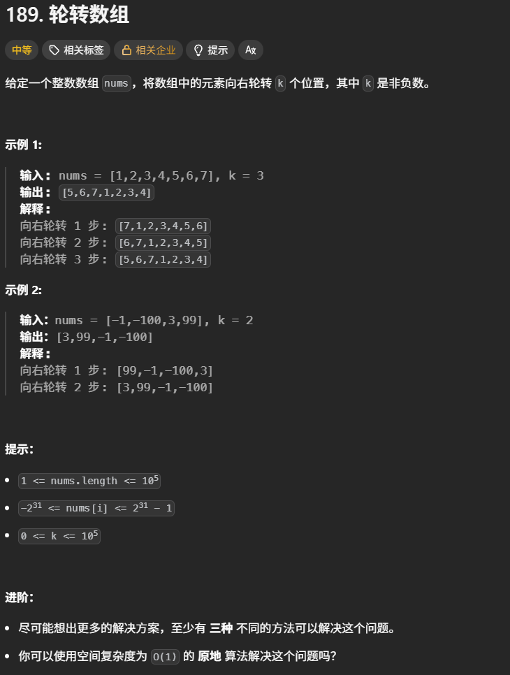 k >= nums.length,可先对k取模(k = k % nums.length),避免无效操作。 - 进阶要求:实现至少三种解法,并给出空间复杂度为 O(1) 的原地算法。