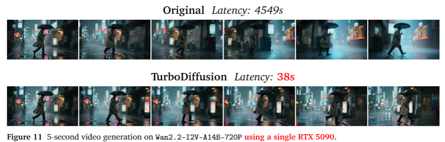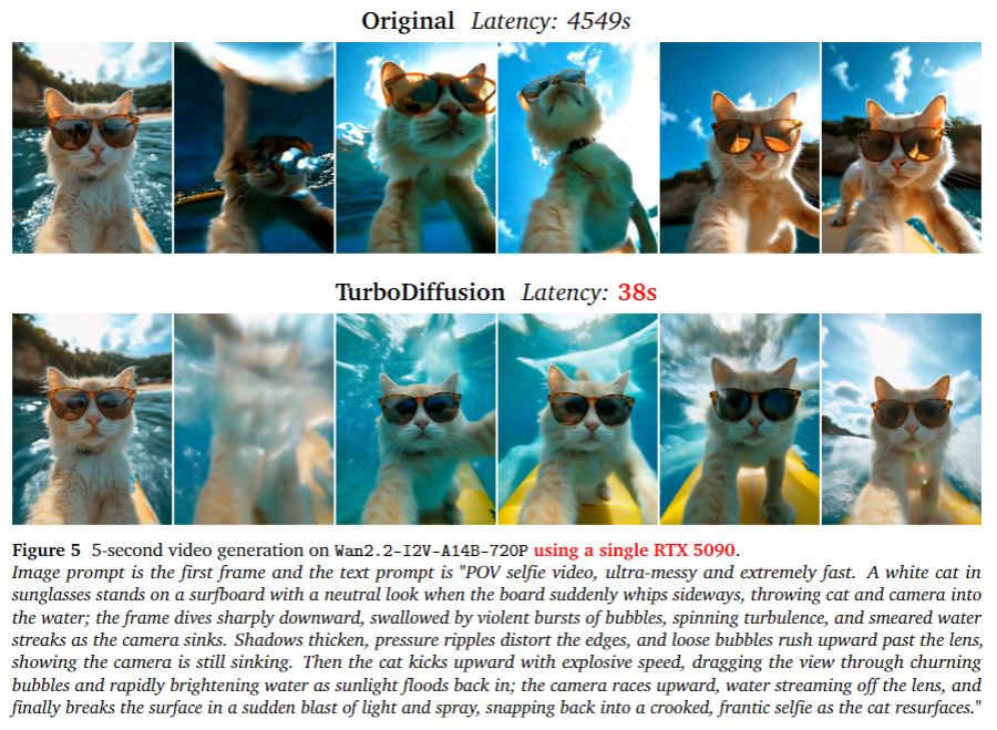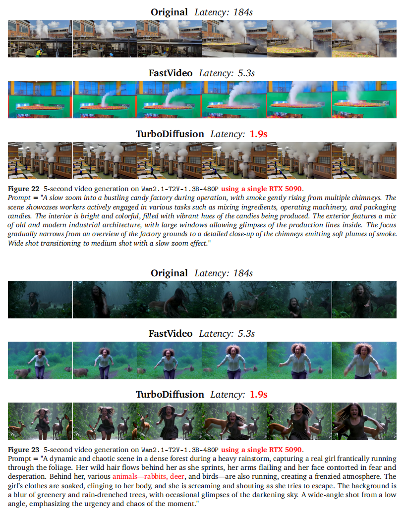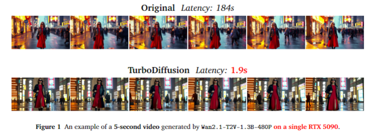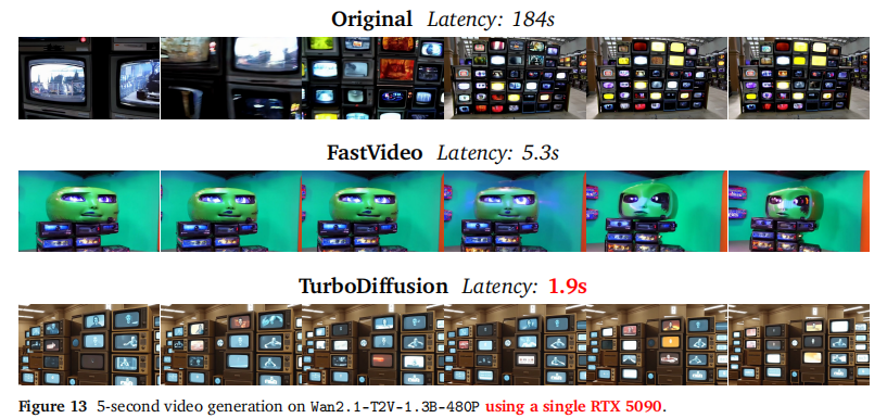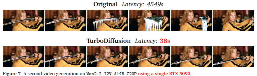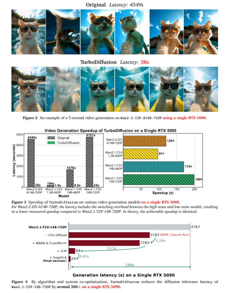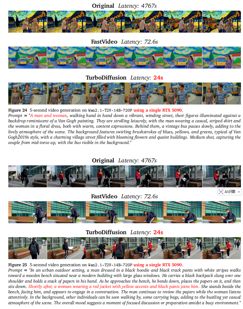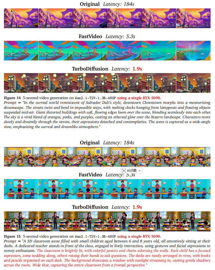 论文还提供了包含模型检查点、训练和推理代码的GitHub仓库,且展示了典型模型的生成延迟对比,如Wan2.1-T2V-1.3B-480P原模型生成5秒视频需184s,TurboDiffusion仅需1.9s。
