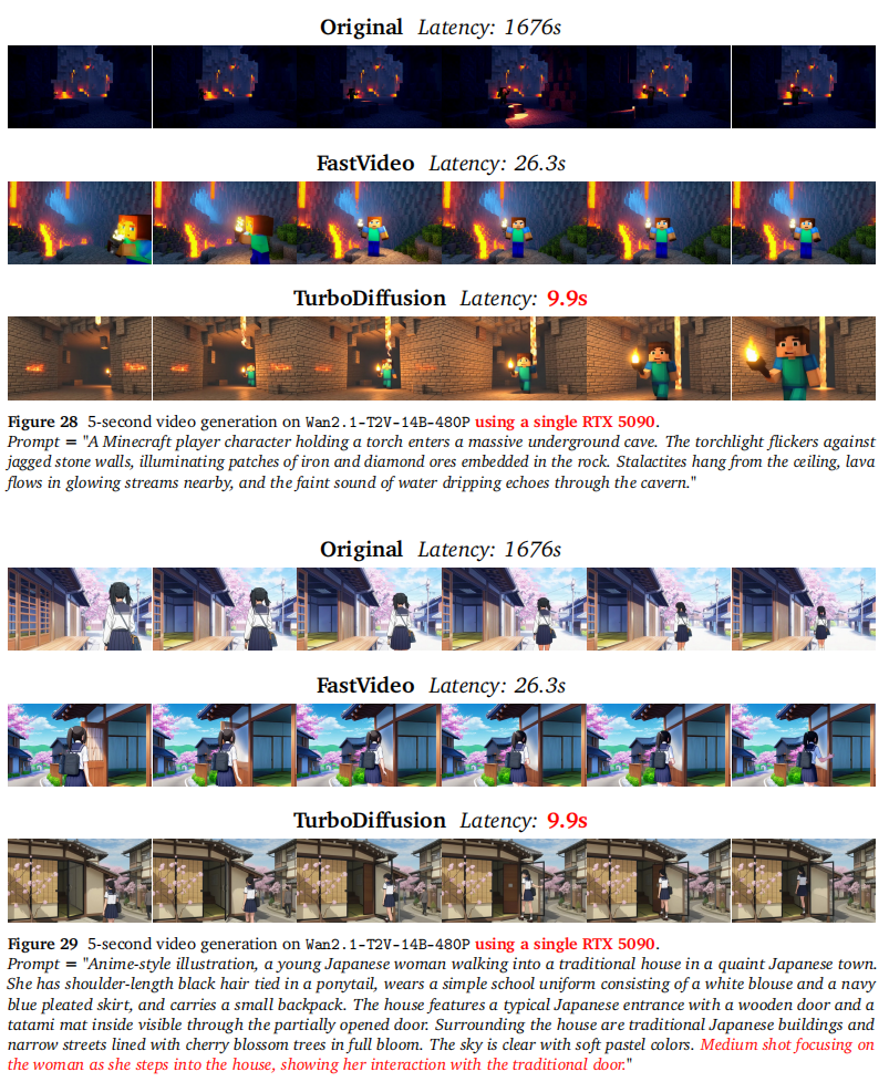- Wan2.1-T2V-14B-480P :生成5秒视频,原模型1676s,FastVideo 26.3s,TurboDiffusion 9.9s,加速比170×,在动漫、游戏等场景中,画质与原模型匹配,速度显著领先FastVideo。存在效果下降