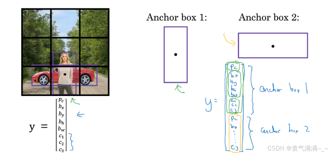 在上图示例中,我们希望同时检测人和汽车。因此,每个网格的的标签中含有两个锚框(Anchor Boxes)。输出的标签结果大小从 3×3×8 变为 3×3×16。若两个 Pc 都大于预设阈值,则说明检测到了两个目标。