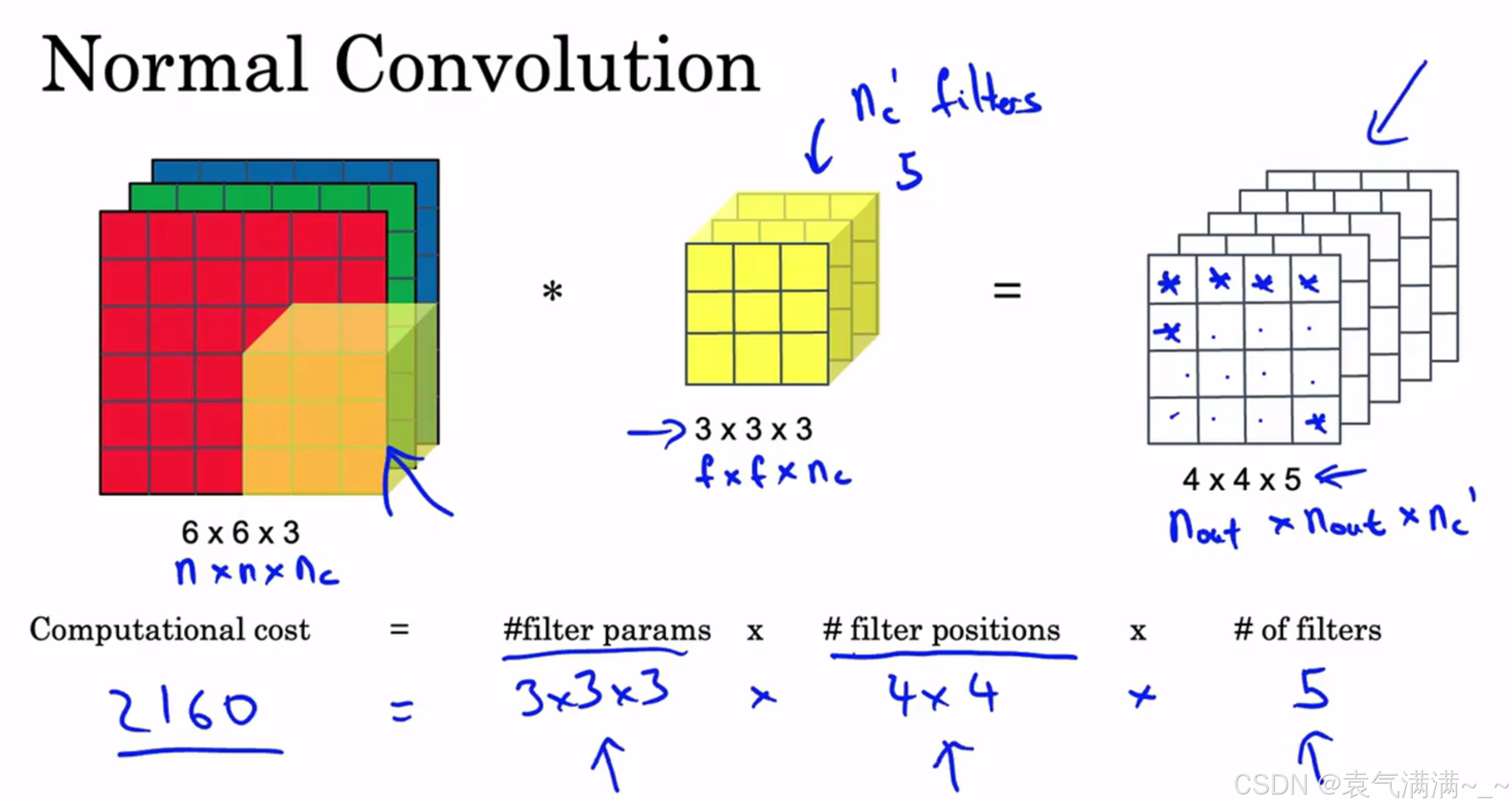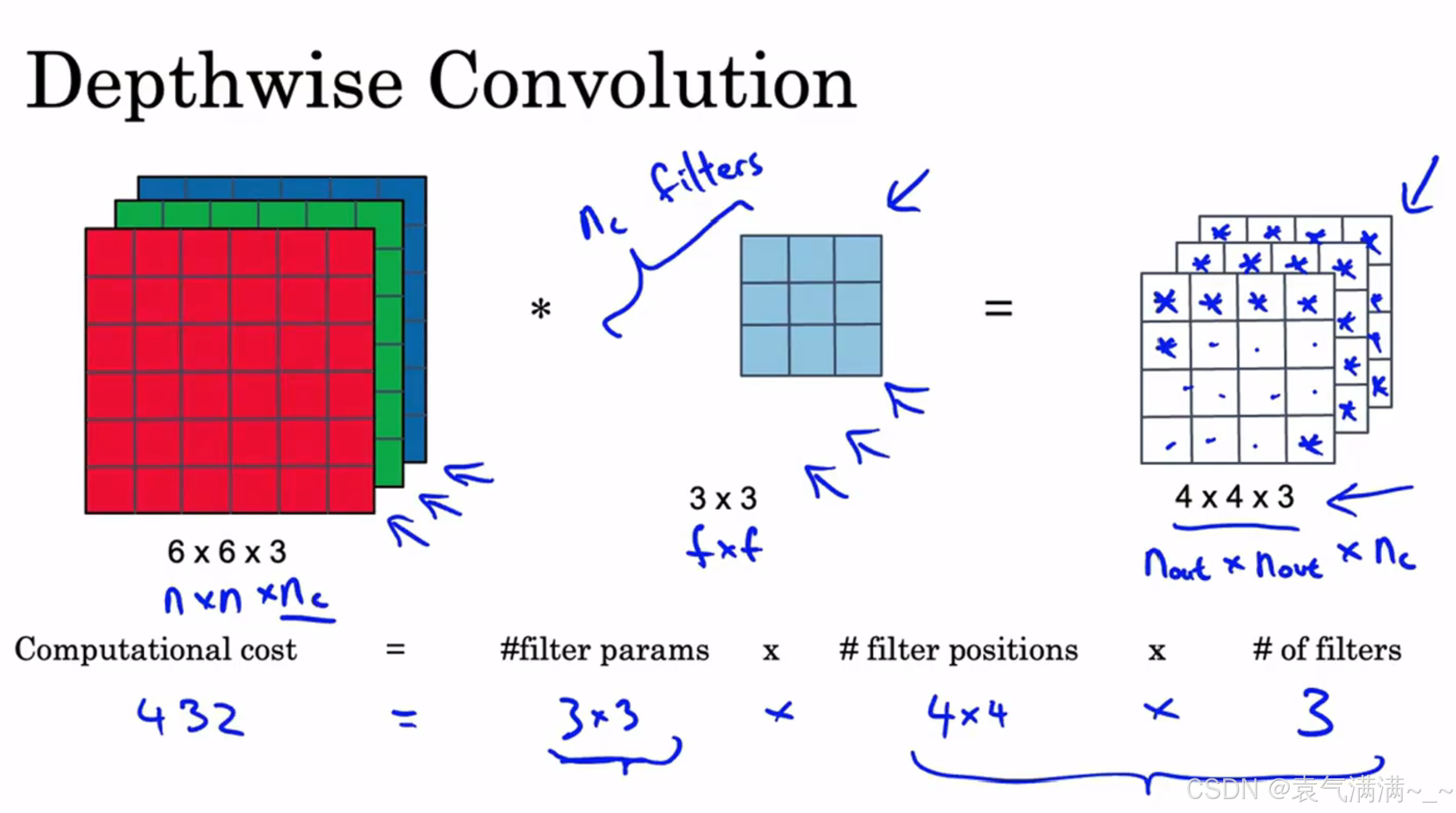 深度可分离卷积计算成本为432+240=672,较常规卷积计算成本降低。一般来说,深度可分离卷积与常规卷积的成本比例为。eg:本例中成本比例为