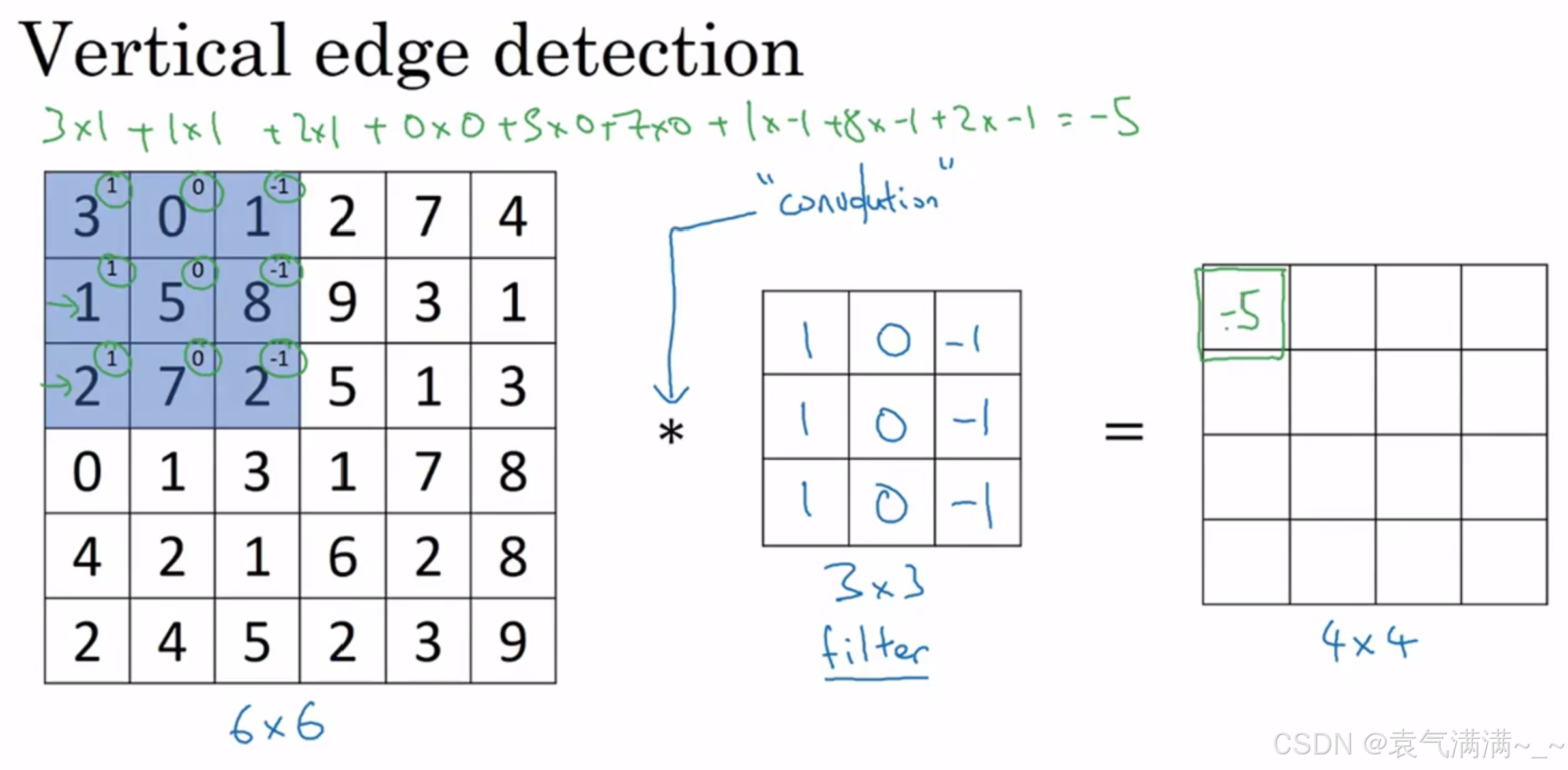 卷积运算的求解过程是从左到右,由上到下,每次在原始图片矩阵中取与滤波器同等大小的一部分,每一部分中的值与滤波器中的值对应相乘后求和,将结果组成一个矩阵。