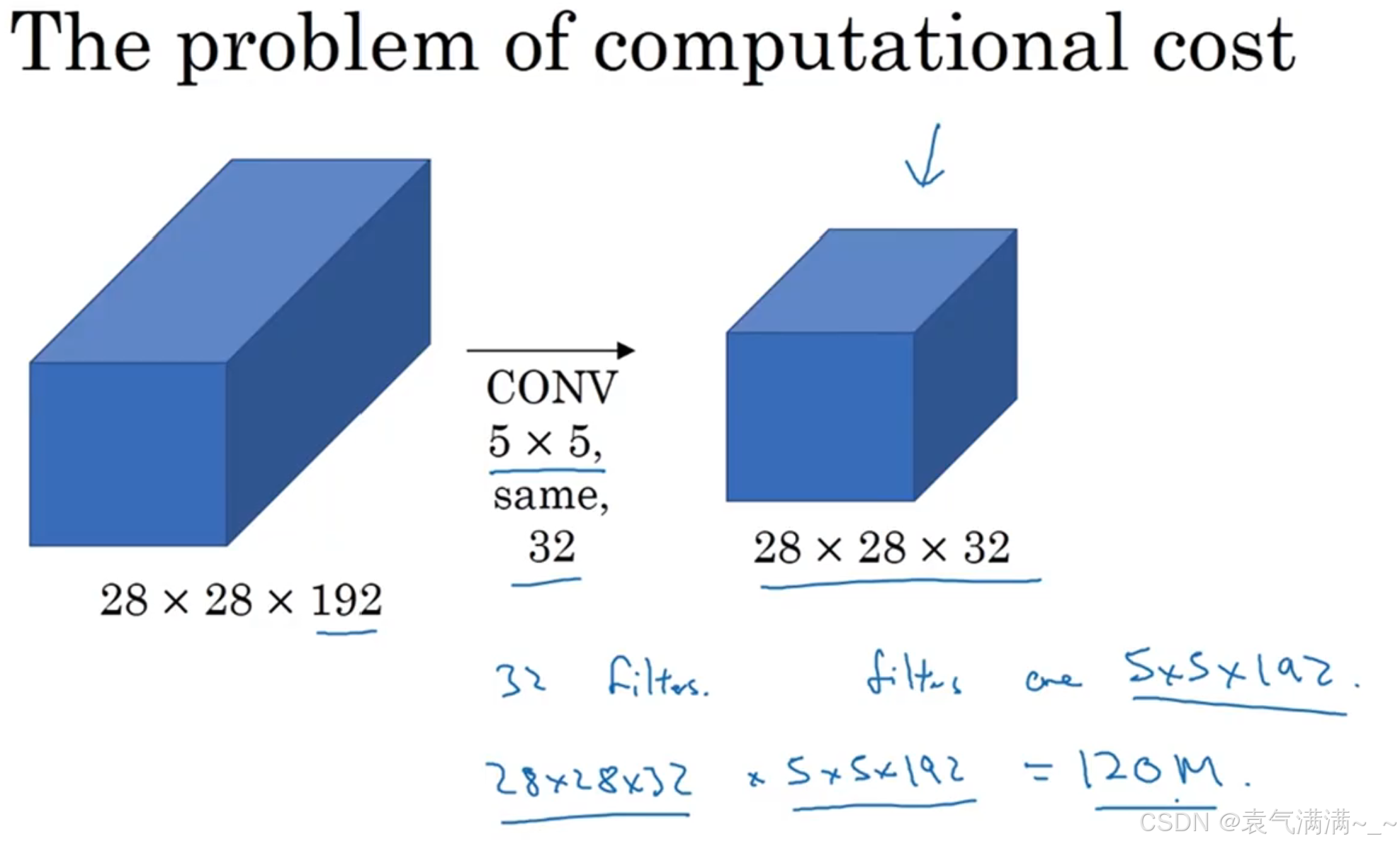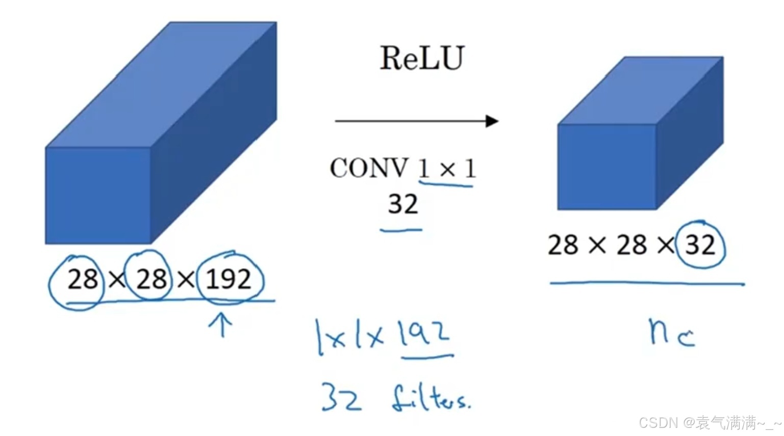 。在如下图所示的例子中,用 32 个大小为 1×1×192 的滤波器进行卷积,就能使原先数据包含的 192 个通道压缩为 32 个。