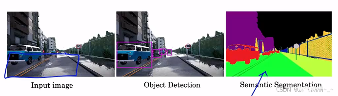 相较于只把物体框出来的目标检测,语义分割会把每一类物体的每个像素都精确地标出来。如下图的示例所示,输入一张图片,语义分割会把每一类物体准确地用同一种颜色表示。