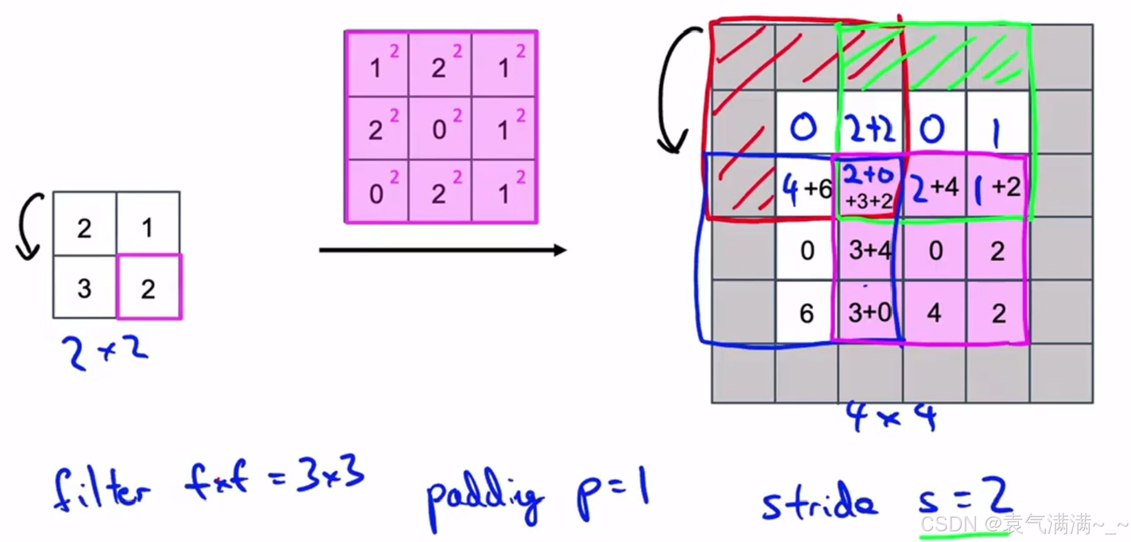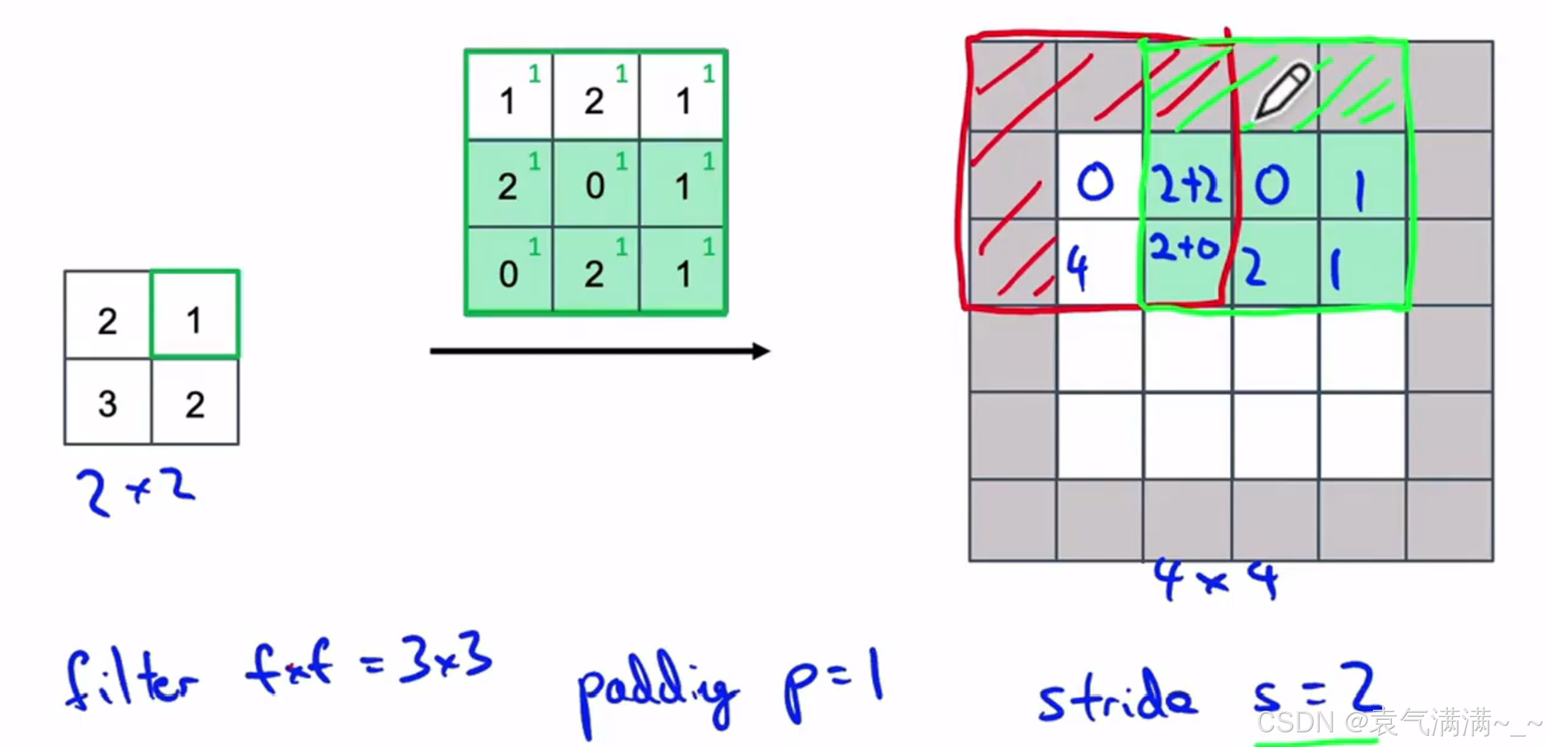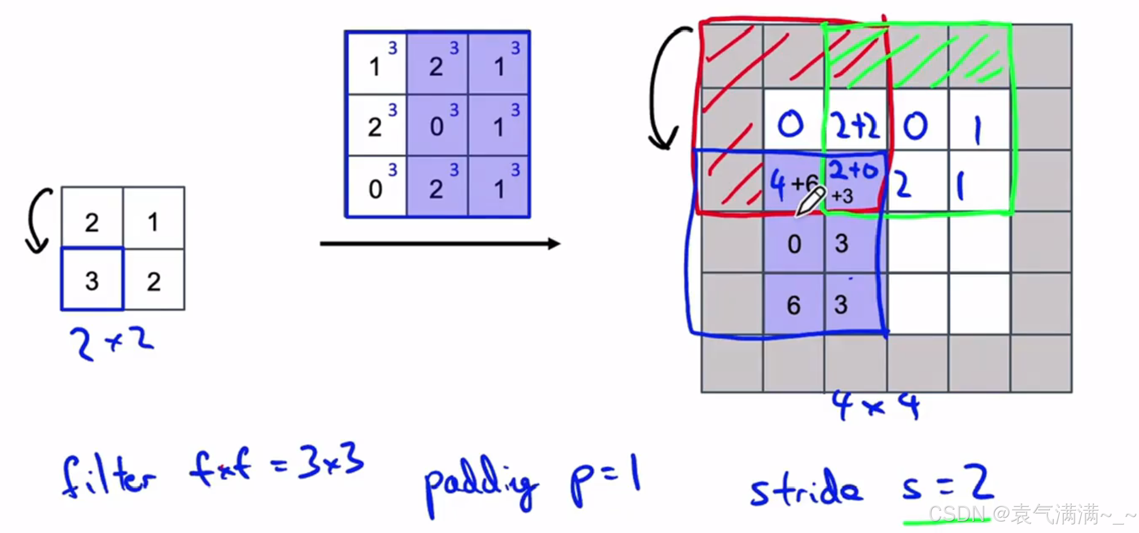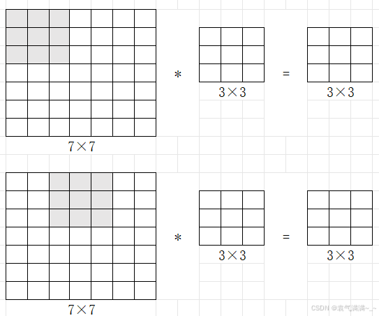 输出尺寸公式:,s为步长,注意公式中有一个向下取整的符号,用于处理商不为整数的情况。向下取整反映着当滤波器,即阴影部分完全包括在图像内部时,才对它进行运算。