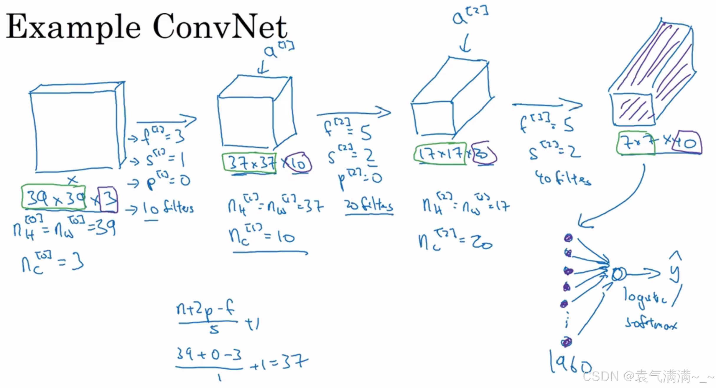 其中,的维度为 7x7x40,将 1960 个特征平滑展开成 1960 个单元的一列,然后连接最后一级的输出层。输出层可以是一个神经元,即二元分类(logistic);也可以是多个神经元,即多元分类(softmax)。最后得到预测输出
