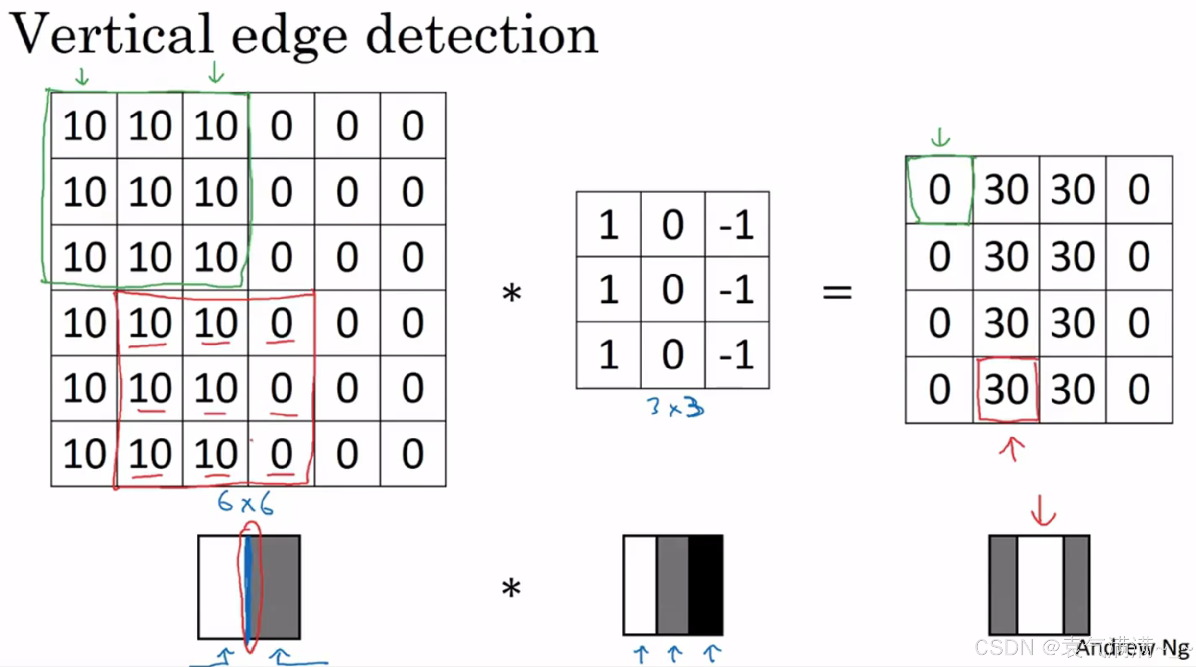 如果将最右边的矩阵当作图像,那么中间一段亮一些的区域对应最左边的图像中间的垂直边缘。