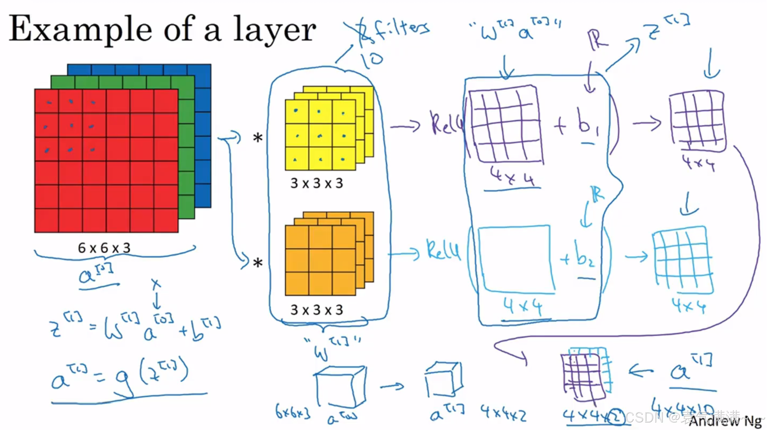 与之前的卷积过程相比较,卷积神经网络的单层结构多了激活函数和偏移量;而与标准神经网络: 相比,滤波器的数值对应着权重