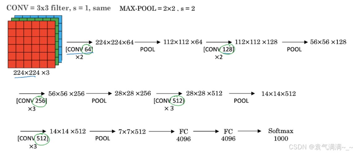 - VGG又称VGG-16,16指网络中包含 16 个带权重的层。