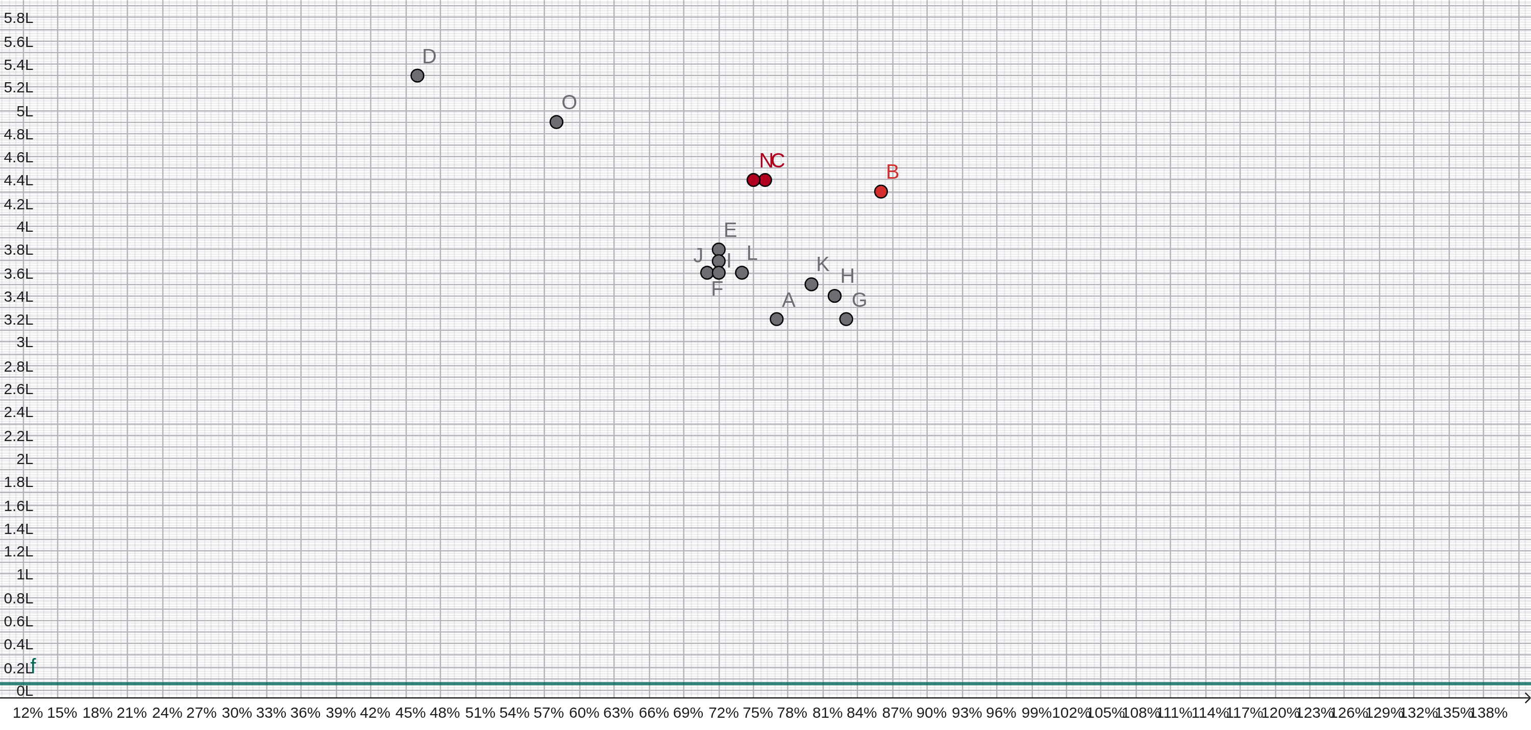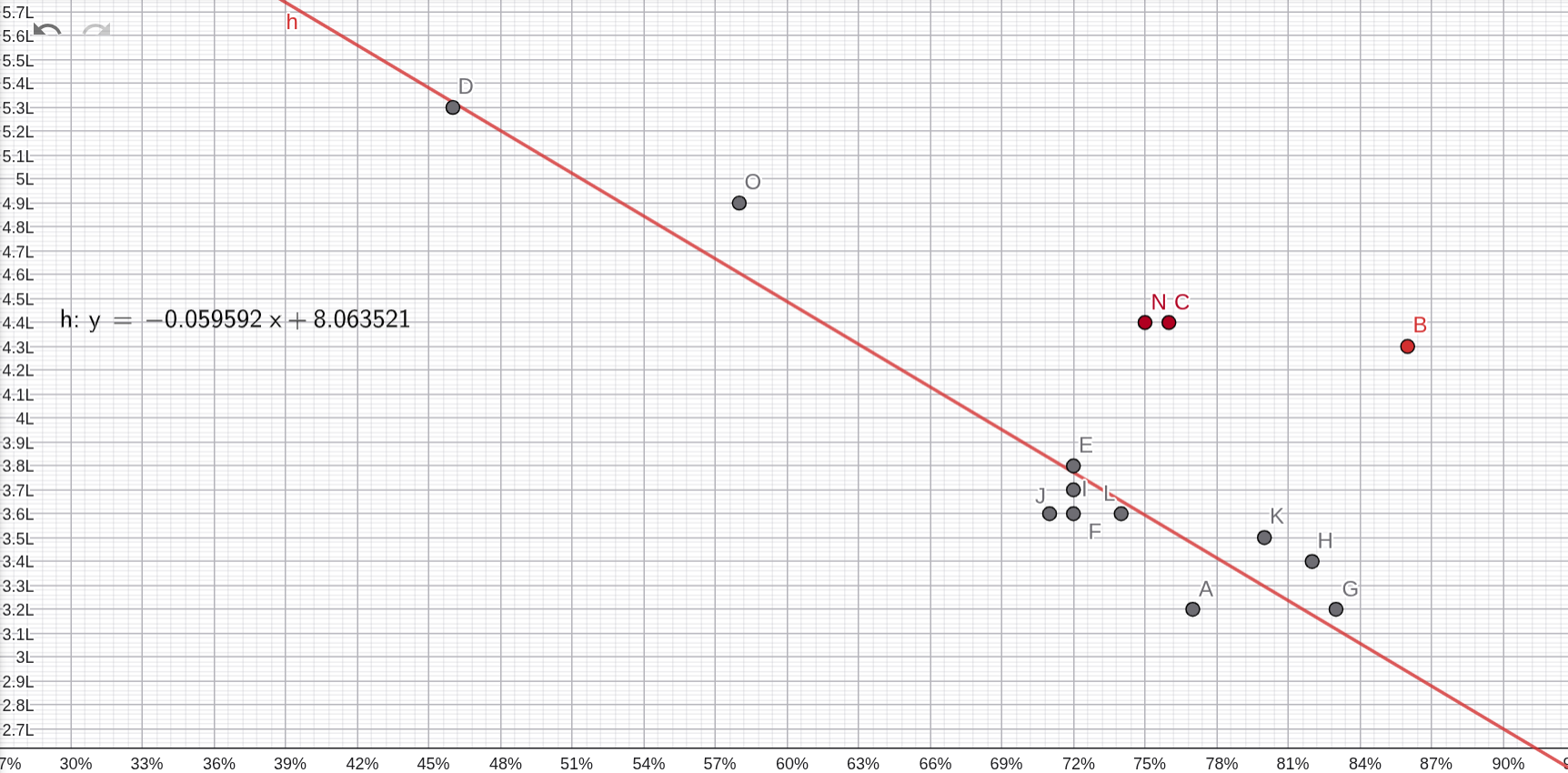 最直观的发现是,数据点2(Point B, EV比86%,油耗4.3L),数据点3(Point C, EV比76%,油耗4.4L)和数据点13(Point N, EV比75%,油耗4.4L)非常特殊。它们呈现出"高EV比但高油耗"的反常现象,与"EV比越高,油耗越低"的普遍认知相悖。