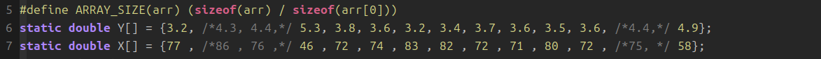 static double Y[] = {3.2, 4.3, 4.4, 5.3, 3.8, 3.6, 3.2, 3.4, 3.7, 3.6, 3.5, 3.6, 4.4, 4.9};