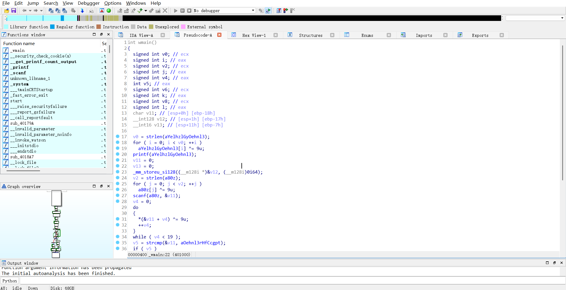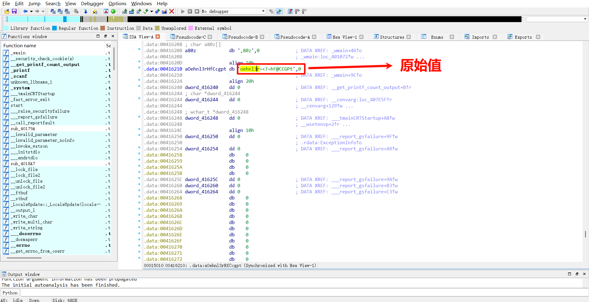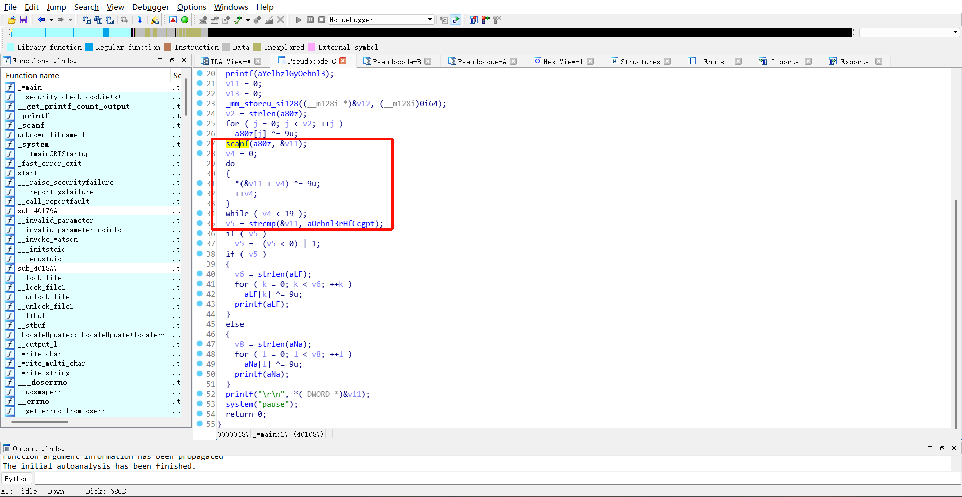 看看代码逻辑,因为在前期观察中发现程序需要接收用户输入,因此着重分析输入相关的函数逻辑。很快能定位到:scanf 接收的输入会存入v11,程序先对v11的每一位字符异或9,再将异或后的结果与 IDA 自动生成的变量名"aOehnl3rHfCcgpt"所指向的原始字节值"oehnl3r=<?=hF@CCGPt"进行字符串对比。