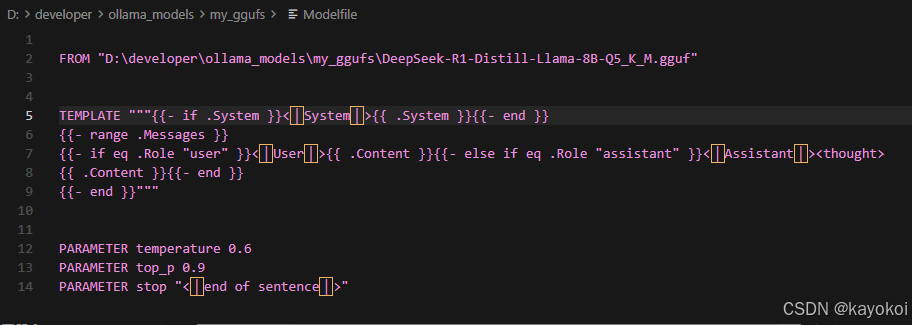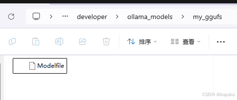 下好文件后,还不能直接用。得在存放 .gguf 文件的目录下建一个名字叫 Modelfile 的文件(注意没后缀),里面写上:
